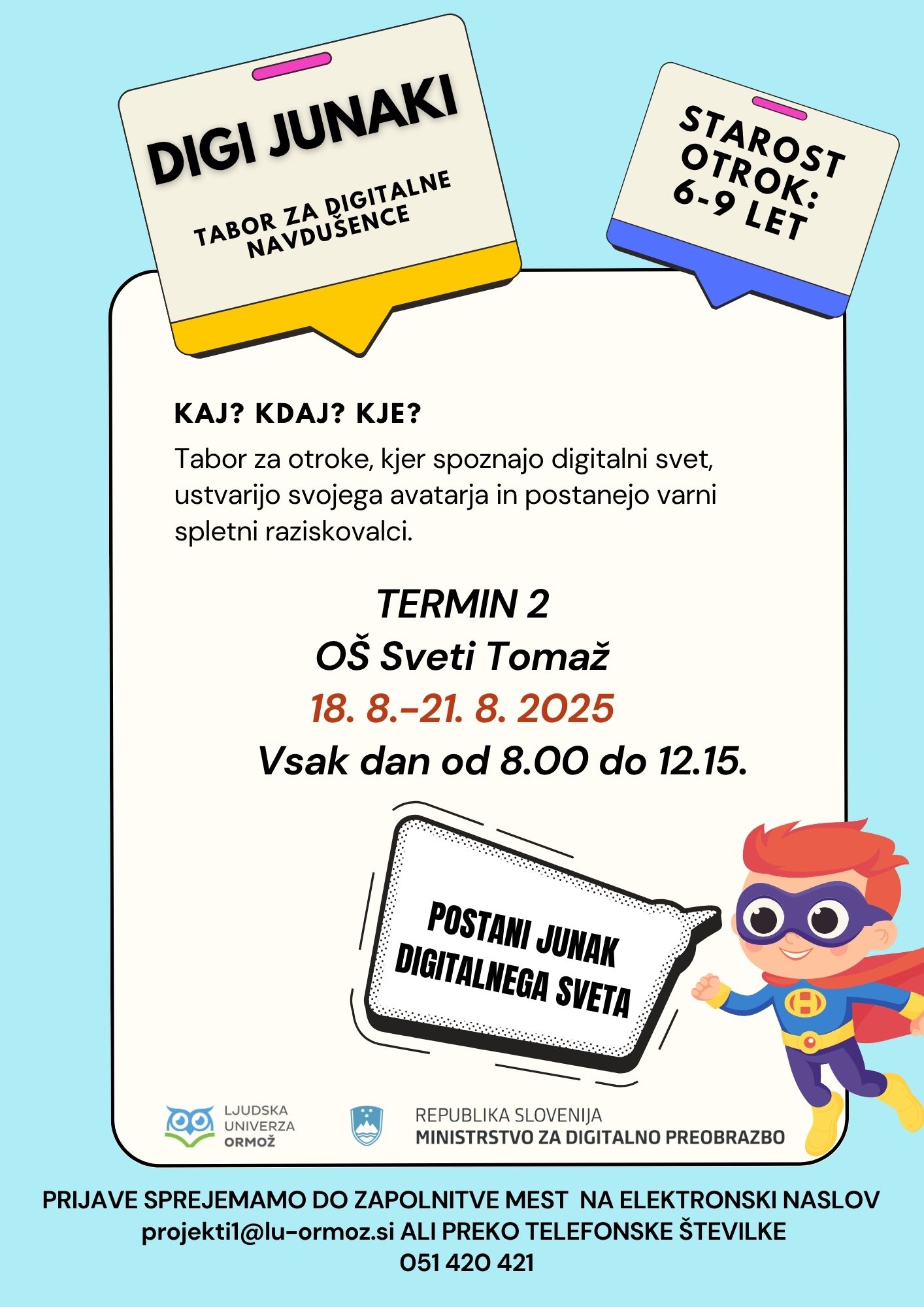 z veseljem vas vabimo, da prijavite svojega otroka na poletni tabor DIGI JUNAKI, ki je namenjen otrokom, starim med 6 in 9 let. Tabor je odlična priložnost za zabavno in poučno preživljanje počitnic, kjer bodo otroci spoznavali digitalni svet, ustvarili svojega avatarja in se naučili, kako postati varni spletni raziskovalci.