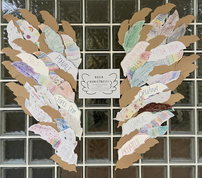 V podaljšanem bivanju pa so otroci stkali čudovite niti prijaznosti, nastal je nabiralnik prijaznosti, metulji prijaznih besed in krila hvaležnosti, ki nas na hodniku spomnijo, na pomen prijaznosti.