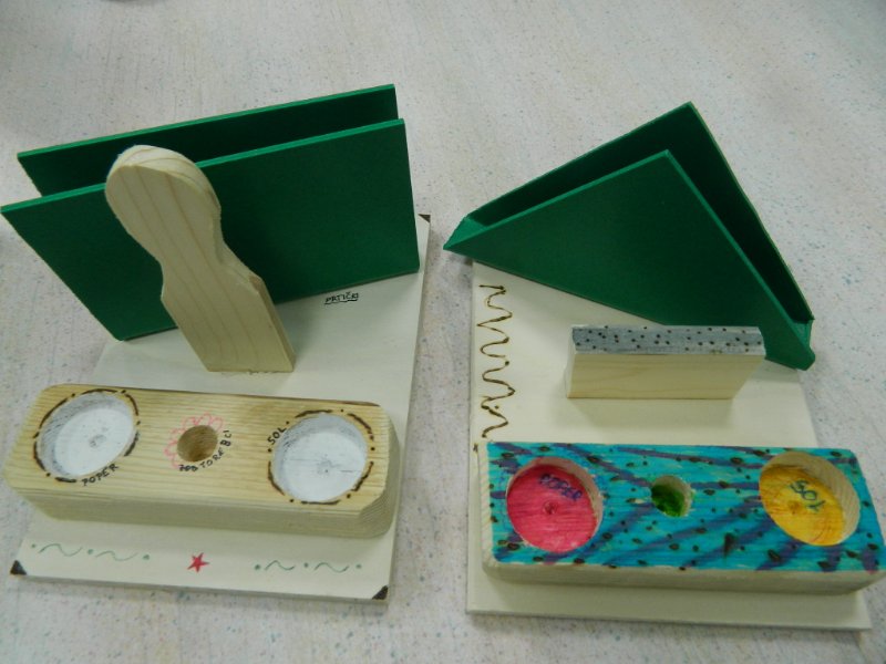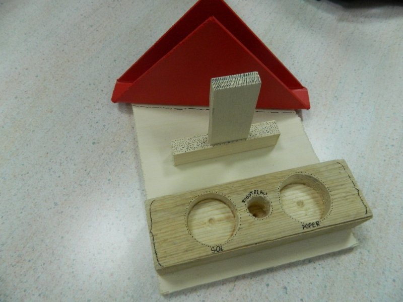 Na začetku nam je učitelj pokazal, kaj bomo delali. Iz plošče iz umetne mase smo naredili stojalo za ptičke, nato sva naredila stojalo za sol in poper in zobotrebce.