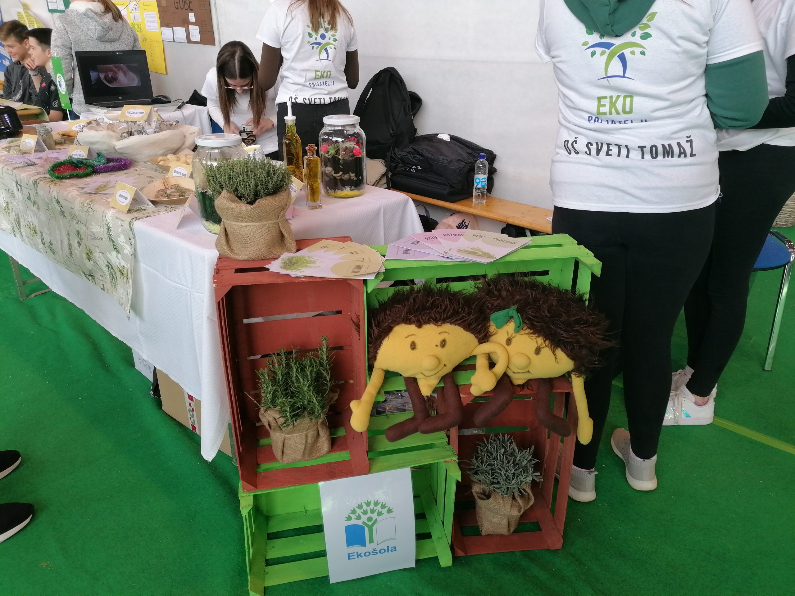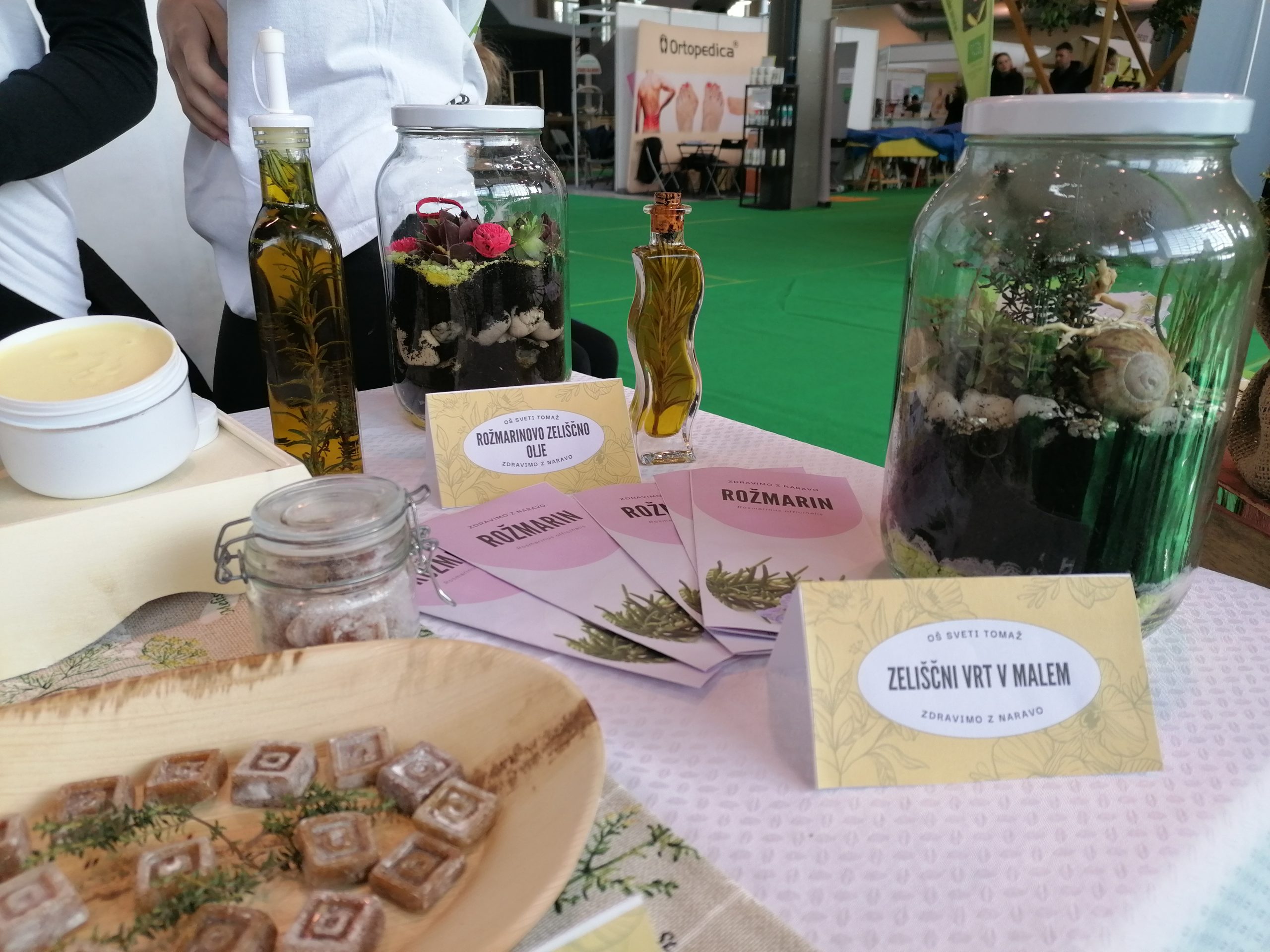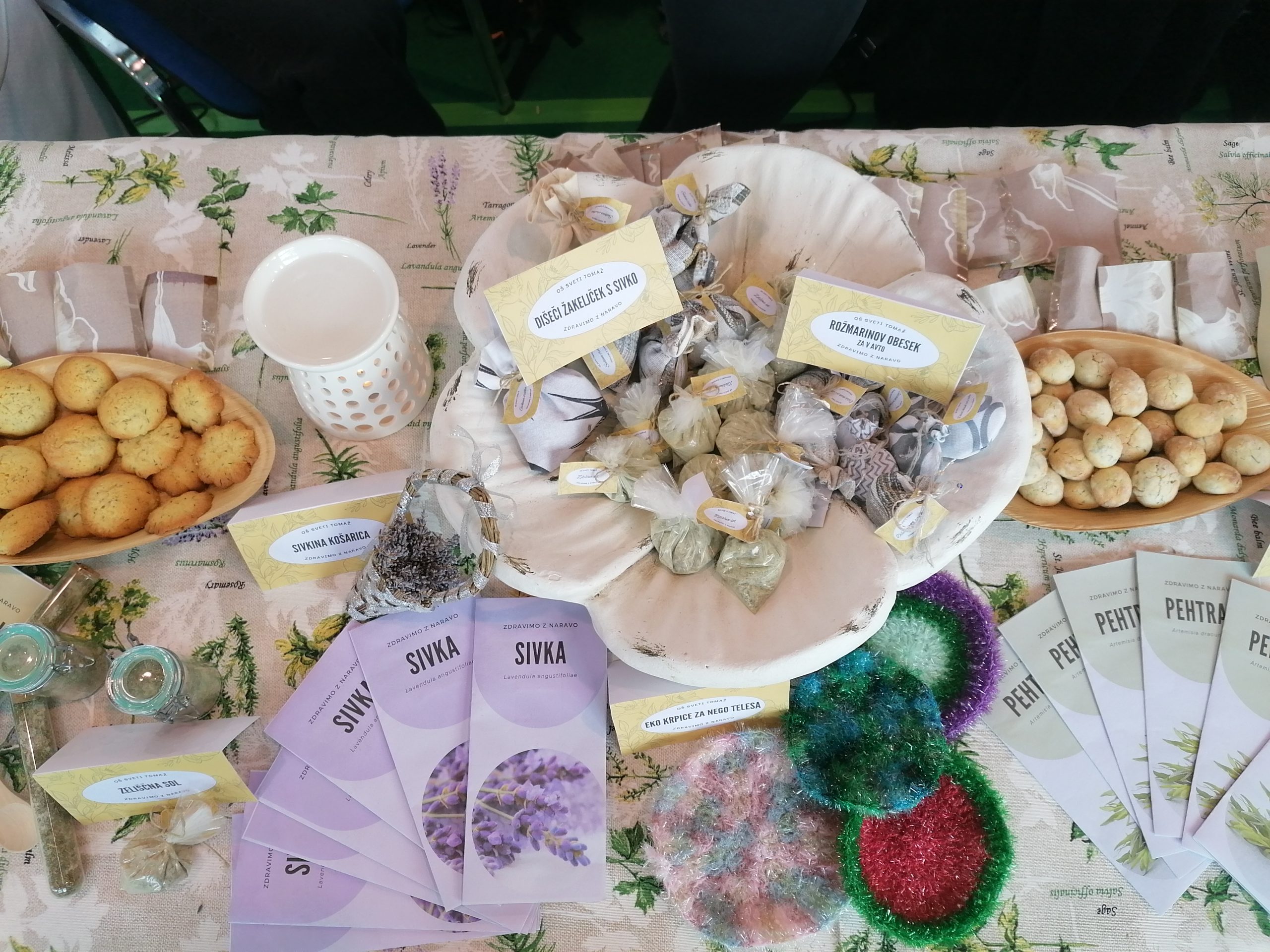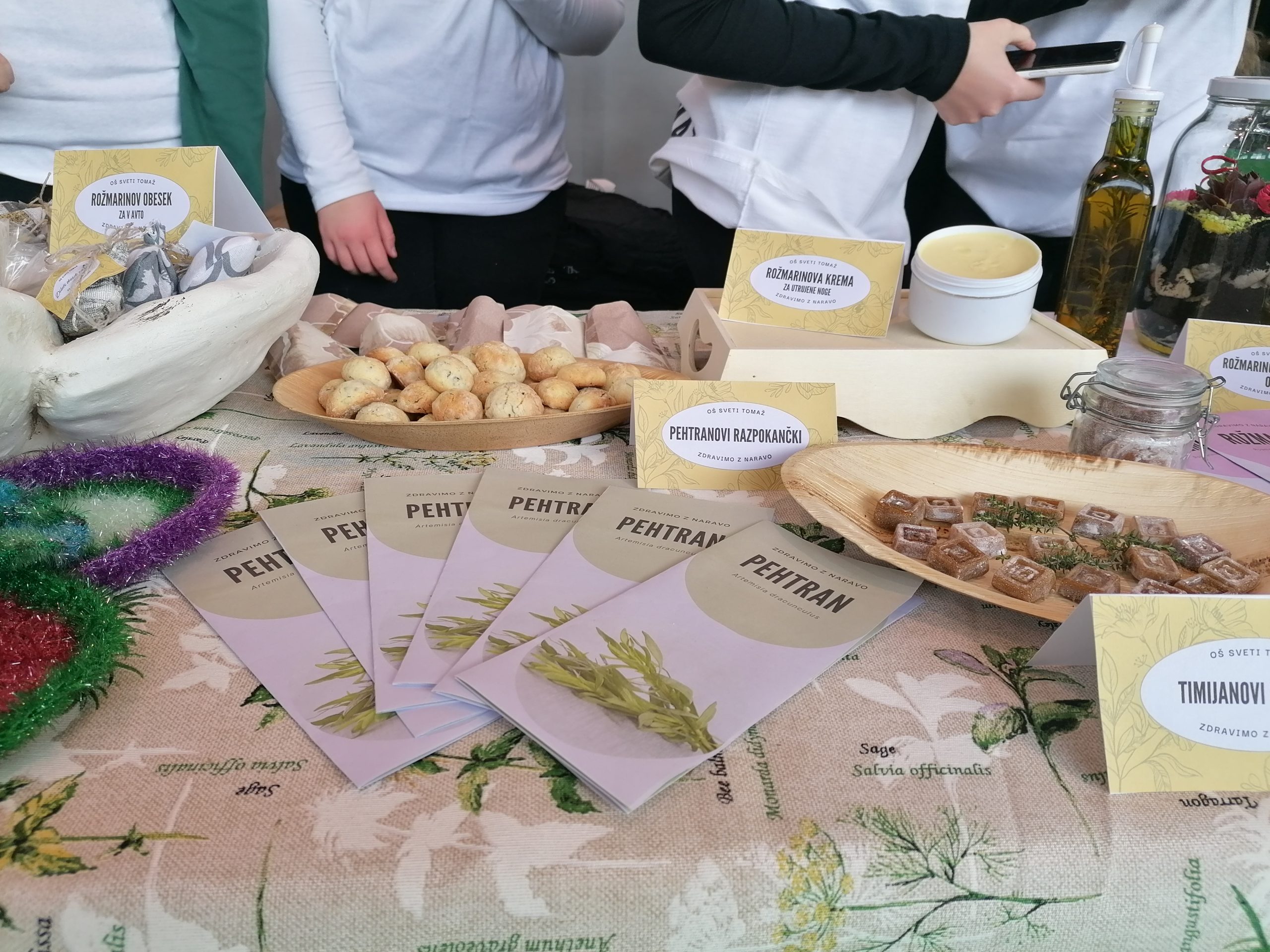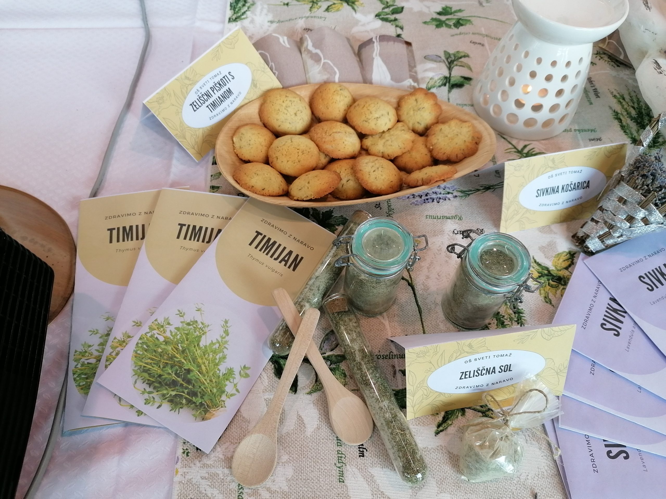 Izdelovali smo timijanove zeliščne bonbone, pehtranove razpokančke, zeliščne piškote, zeliščno sol, rožmarinovo olje, mini zeliščni vrt v steklenici, eko krpice za nego telesa, rožmarinove obeske za v avtomobil, sivkine žakeljčke, rožmarinovo kremo za utrujene noge …