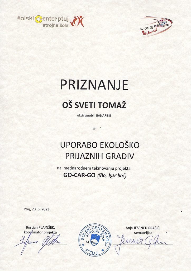 Tudi letos so se učenci 8. a razreda odločili za sodelovanje v projektu GoCarGo in GocarGo Plus. V tem projektu izdelujejo avtomobilčke. Letos so se tudi učenke odločile, da bodo sodelovale v projektu. Učenke so izdelale avtomobiček z imenom Banarbi. Zamisel je bila, da bo izgled avtomobila v obliki banane, izdelale pa so ga Barbike. Mislim, da jim je avto zelo uspel. Predvsem oblikovno in barvno uskladitev je bila na visokem nivoju, obenem pa je bila na srečanju prva dekliška ekipa z avtomobilom. Na tekmovanju v Ptuju je njihov avtomobil dosegel veliko pozornosti in občudovanja. Ravno tako kamermana iz TV Slovenije. Za izdelan avtomobil jim čestitamo. Ravno tako za trud in oblikovalske sposobnostii, Tudi ekipa je bila v barvah barbik. Učenke so prejele Priznanje za Oblikovalne dosežke. Tekmovanje velja za meddržavno, saj tekmujejo tudi učenci iz Hrvaške in Srbije.