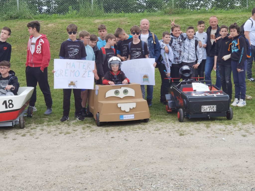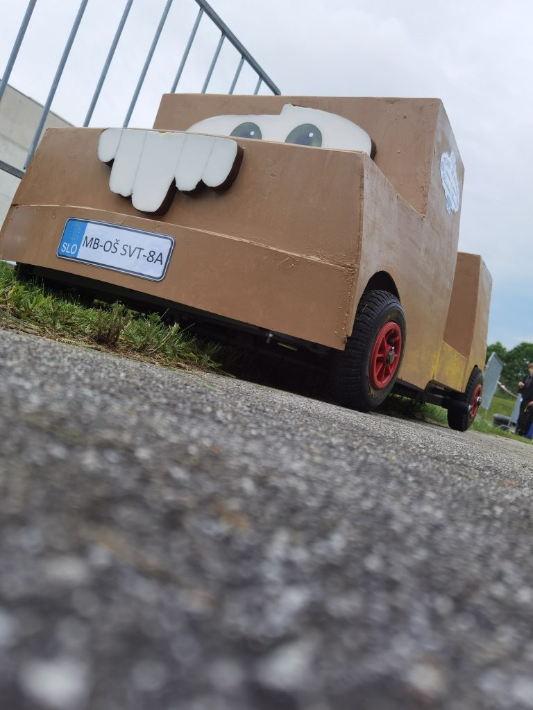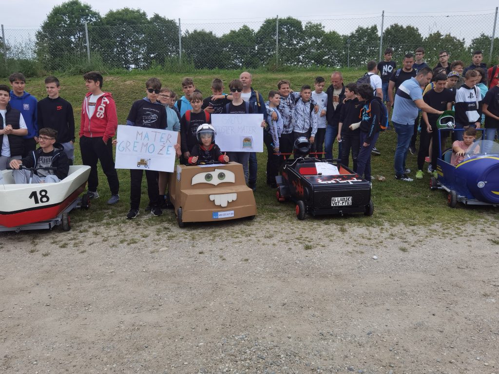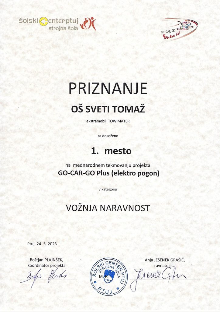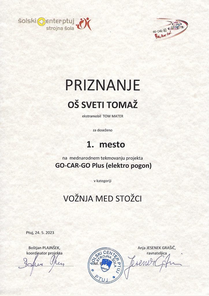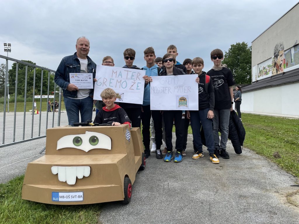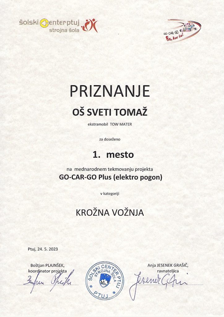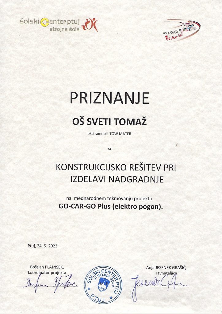 Učenci 8. a razreda so se odločili, da bodo sodelovali v projektu GoCarGo Plus. Izdelali bodo avtomobil na električni pogon z imenom Tow Mater. Z izdelovanjem smo pričeli januarja, vsaki teden 2 uri. Med izdelovanjem smo dosegli številna znanja. Težave smo sproti reševali. Danes mo se udeležili mednarodnega srečanja GoCarGo Plus na Ptuju. Sodelovali so tudi učenci iz Srbije. Naš Tow Mater se je odlično izrezal. Voznik je bil Gregor, poganjal pa ga je “mišičnjak ” Miha. V vožnji na čas smo dosegli tri 1. mesta: v Vožnji naravnost, v slalomu in v vožnji okoli gum. Gregorjeve spretnosti in hitrosti Tow Materja noben drugi avtomobil ni bil kos. Dobili smo tudi priznanje za oblikovalne dosežke. Vsem učencem za dosežke čestitamo.