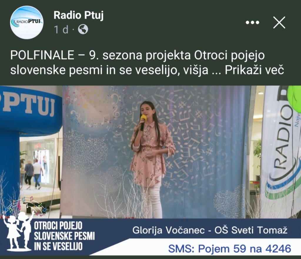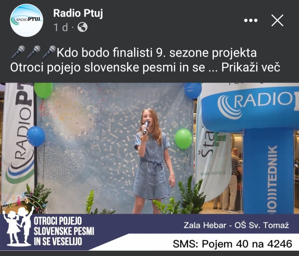 V projektu Radia-Tednik Ptuj »Otroci pojejo slovenske pesmi in se veselijo« sta se na polfinalnih nastopih uspešno predstavili naši učenki Zala Hebar iz 4. razreda in Glorija Vočanec iz 7. razreda. Za uvrstitev v finale jima lahko pomagate z sms glasovanjem. Glasovanje poteka od 25. 6. – 9. 7. 2023!
