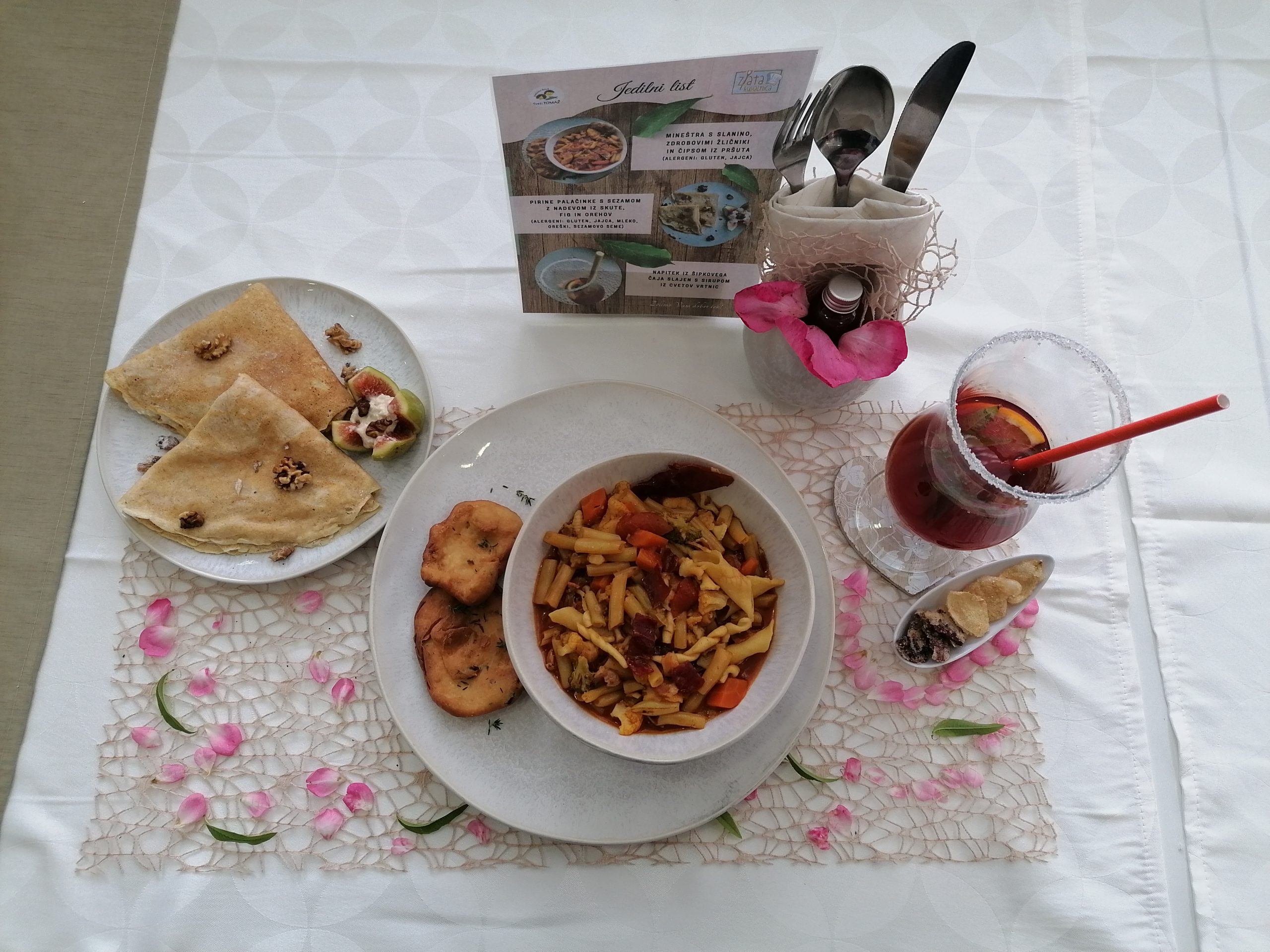 Ekipa je pripravila odlično mineštro z zdrobovimi žličniki in čipsom iz pršuta, pirine palačinke s sezamom in skutno-figovim nadevom ter napitek iz šipkovega čaja slajen s sirupom iz cvetov vrtnic.