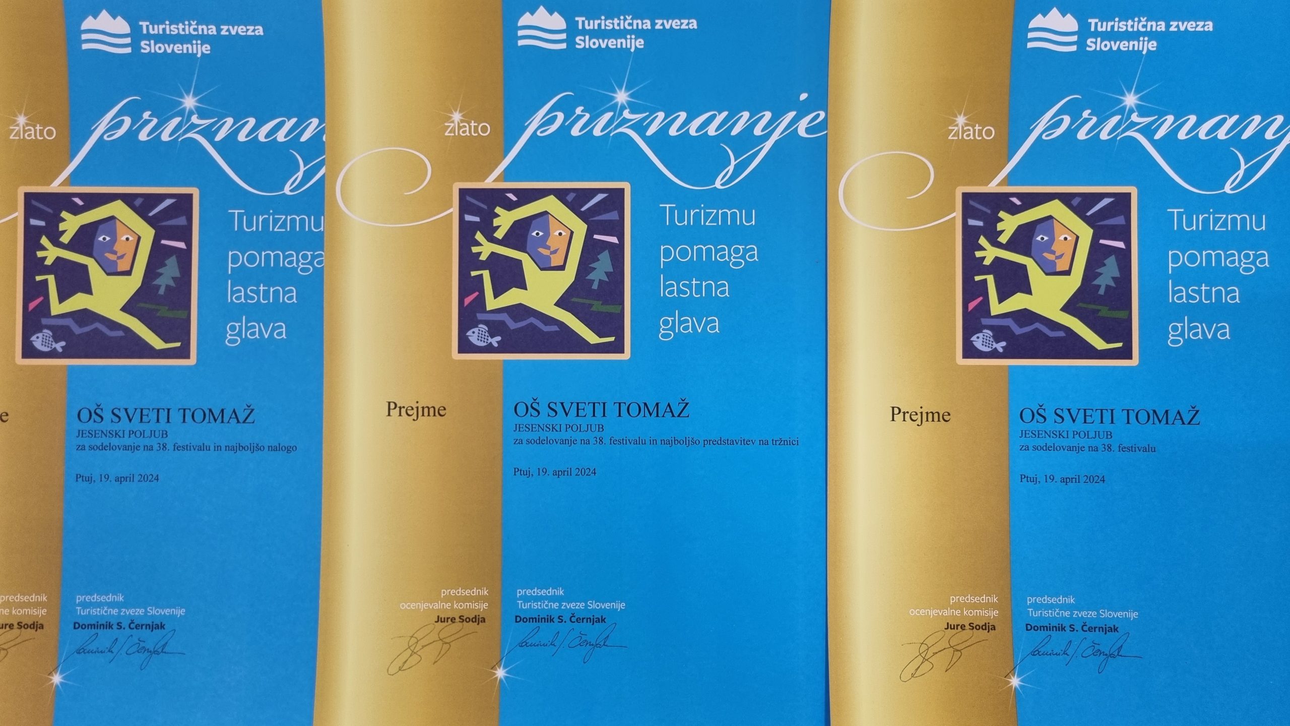 Prejeli smo kar 3 ZLATA priznanja (za sodelovanje, za najboljšo nalogo in najboljši nastop na turistični tržnici).