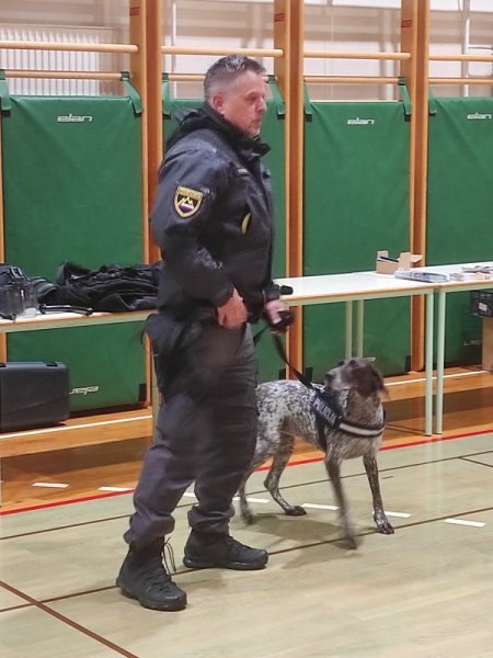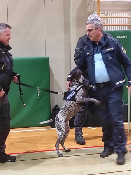 Vodnik službenega psa je s svojo psičko razveselil otroke tako, da sta pokazala kaj psička zmore in kako ubogljiva je.