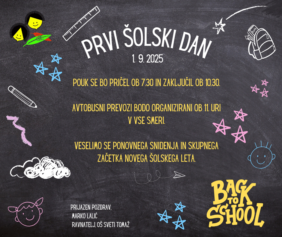 počitnice se iztekajo in pred nami je novo šolsko leto. Obveščamo vas, da bo prvi šolski dan v ponedeljek, 1. 9. 2025.