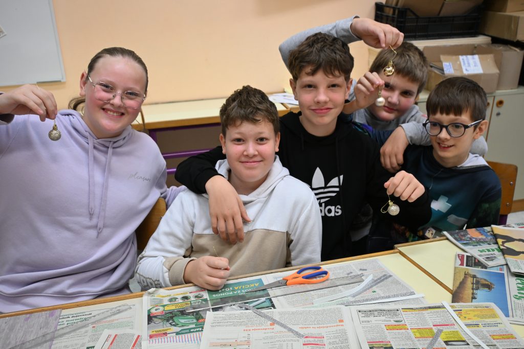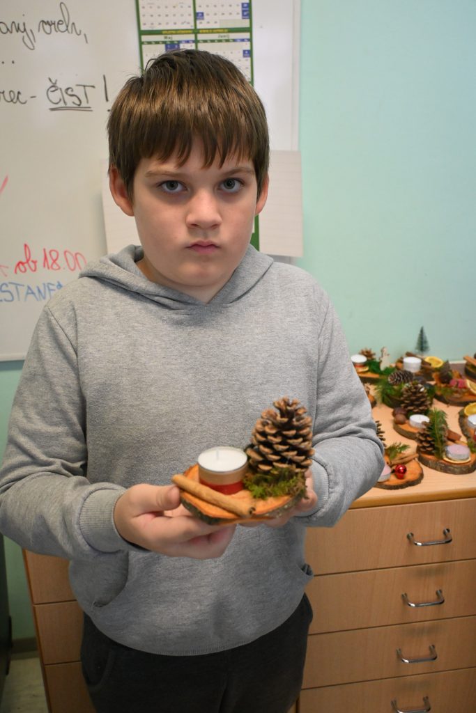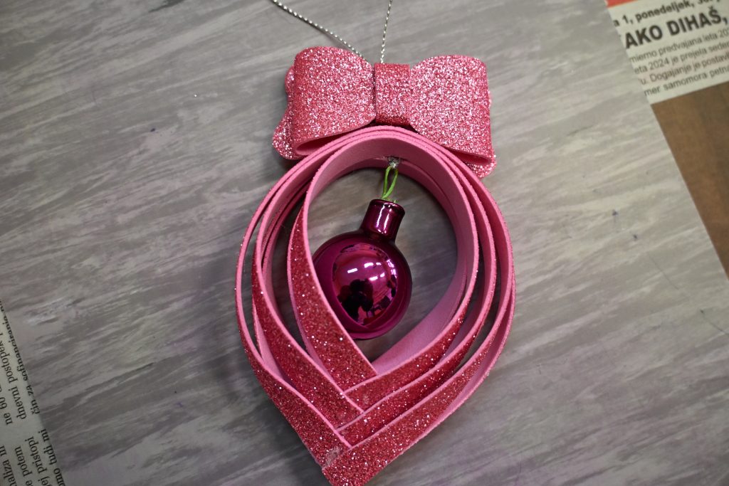 Izdelovali smo okraske za smreko iz tenis žogic. Imeli smo kar veliko dela, saj smo zarisovali, rezali in lepili. Pri delu smo morali biti potrpežljivi, previdni in natančni. Razdelili smo se v tri skupine in začeli z delom. Pri izdelovanju smo tudi uživali ob poslušanju božičnih pesmi.