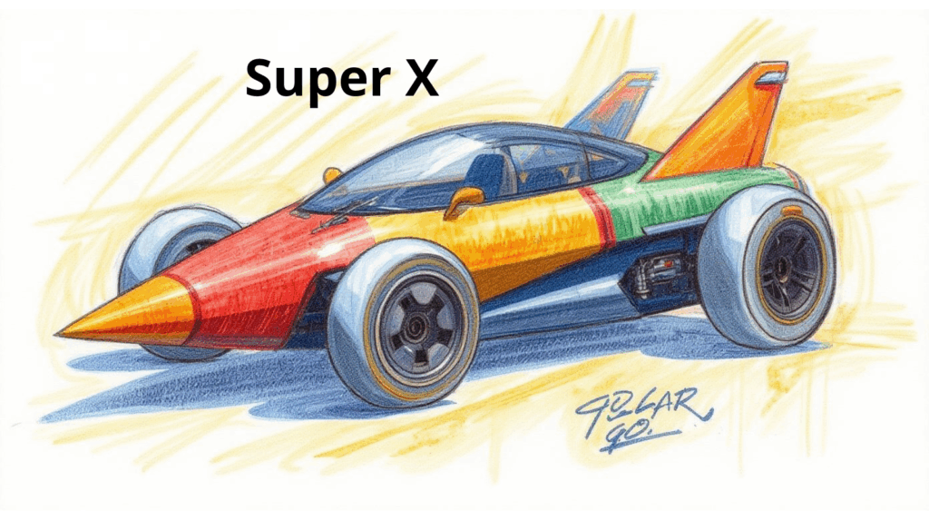 Letos smo pričeli z načrtovanjem avtomobila v projektu GoCarGo že zgodaj. Izbrali smo avtomobil Super x. Nato pa je sledil šok, organizatorji projekta GoCarGo so spremenili pravila. Izdelati bo potrebno avtomobil v obliki vesoljskega plovila oziroma vozila. Ker se nismo mogli odločiti, kako bi izgledal avtomobil, smo poprosili Umetno inteligenco, da nam je pomagala. V Canvi smo s pomočjo umetne inteligence izdelali avomobil Super X, ki bo izgledal takole.