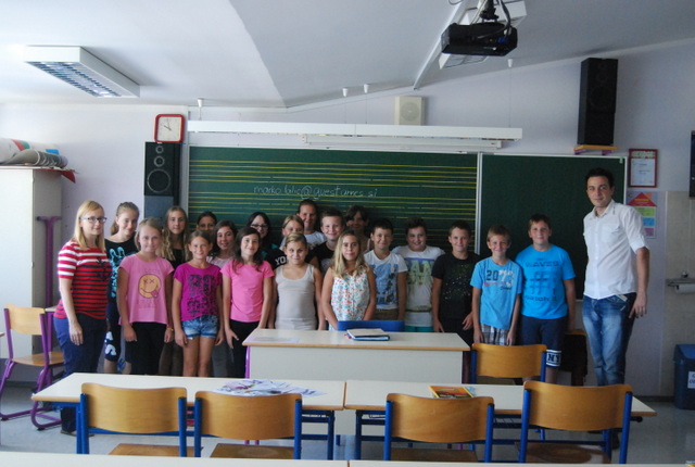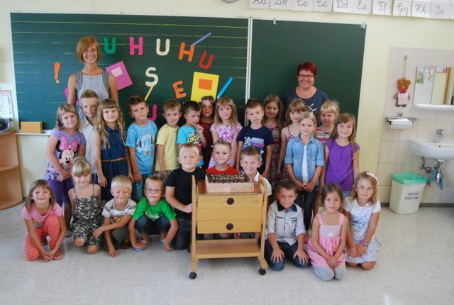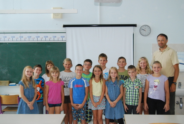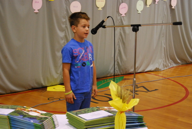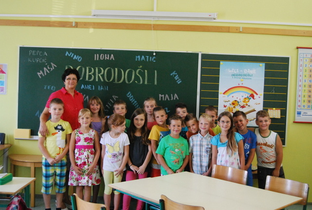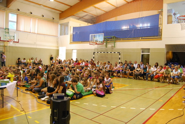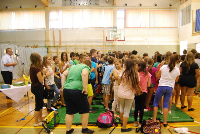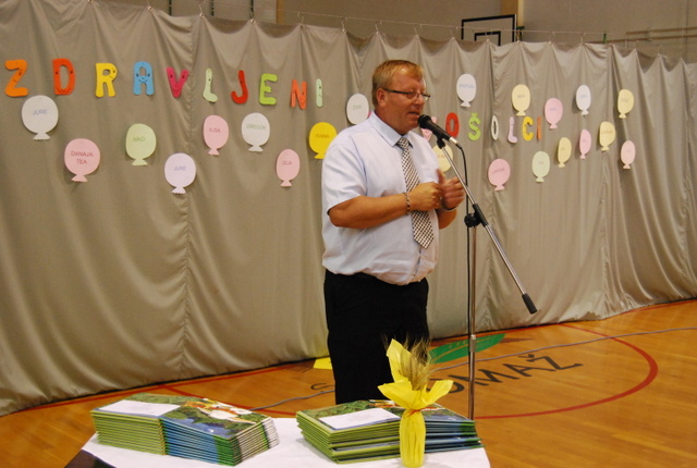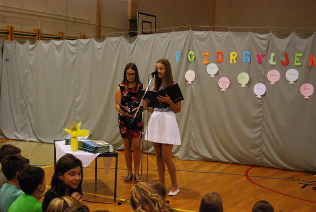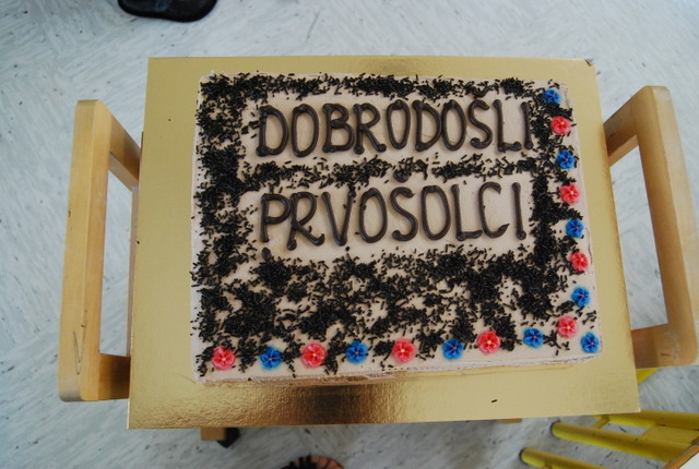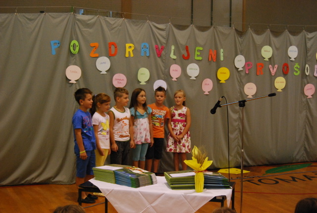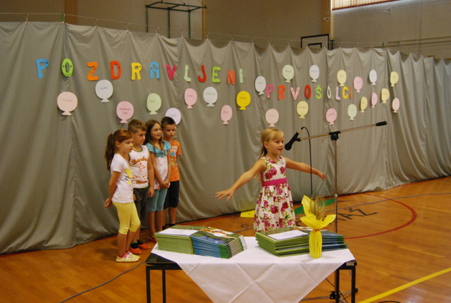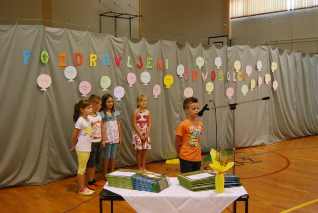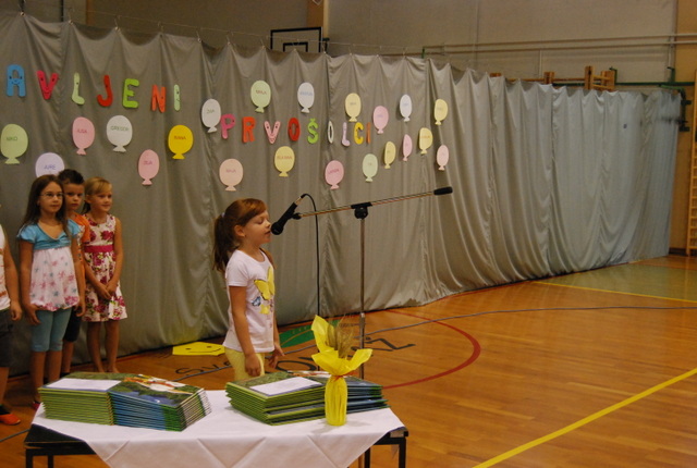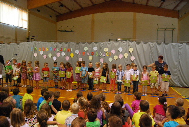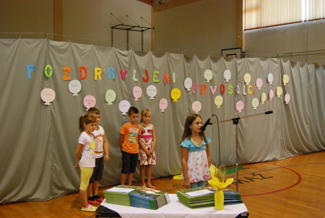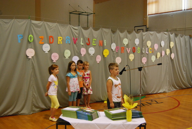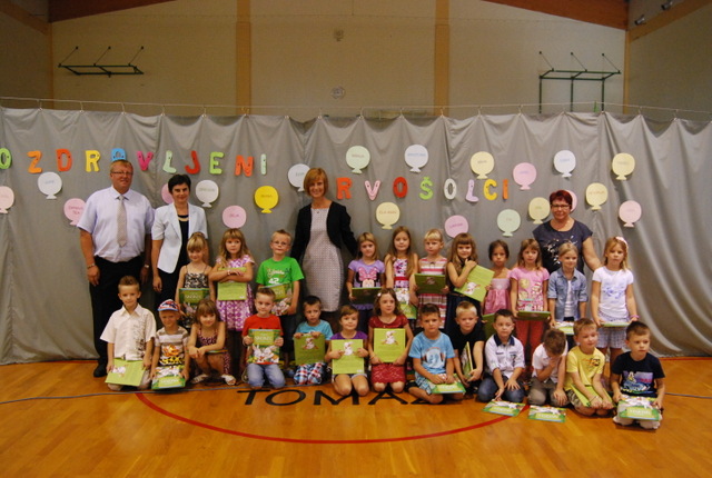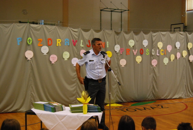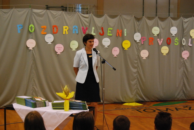 Učenci OŠ Sveti Tomaž smo prvošolčke pričakali v telovadnici. Pozdravili so jih g. župan, ga. ravnateljica ter rajonski policist.