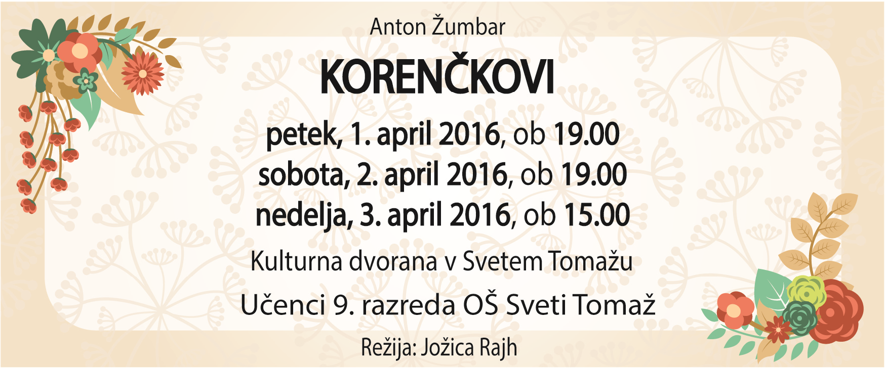 Vabimo Vas, da se nam pridružite v kulturni dvorani v Svetem Tomažu, kjer bomo učenci 9. razreda uprizorili igro “Korenčkovi”, avtorja Antona Žumbarja. Igro je režirala Jožica Rajh.