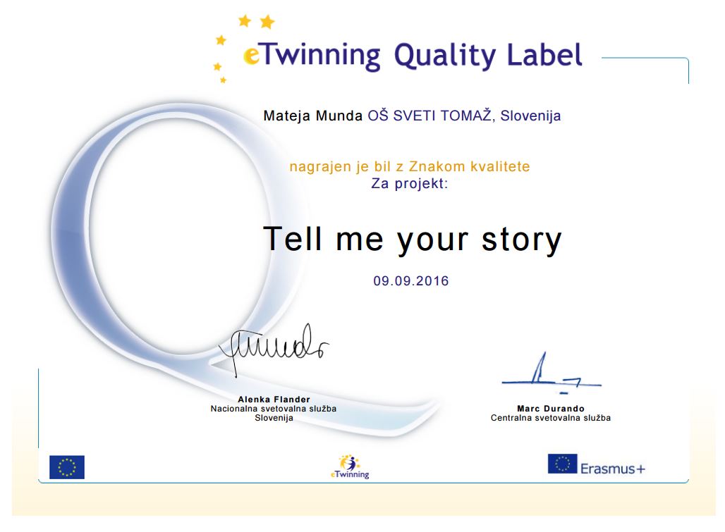 V šolskem letu 2015/2016 je naša šola sodelovala v mednarodnem projektu eTwinning: Tell me your story. Naše izdelke ste lahko spremljali na naši spletni strani.