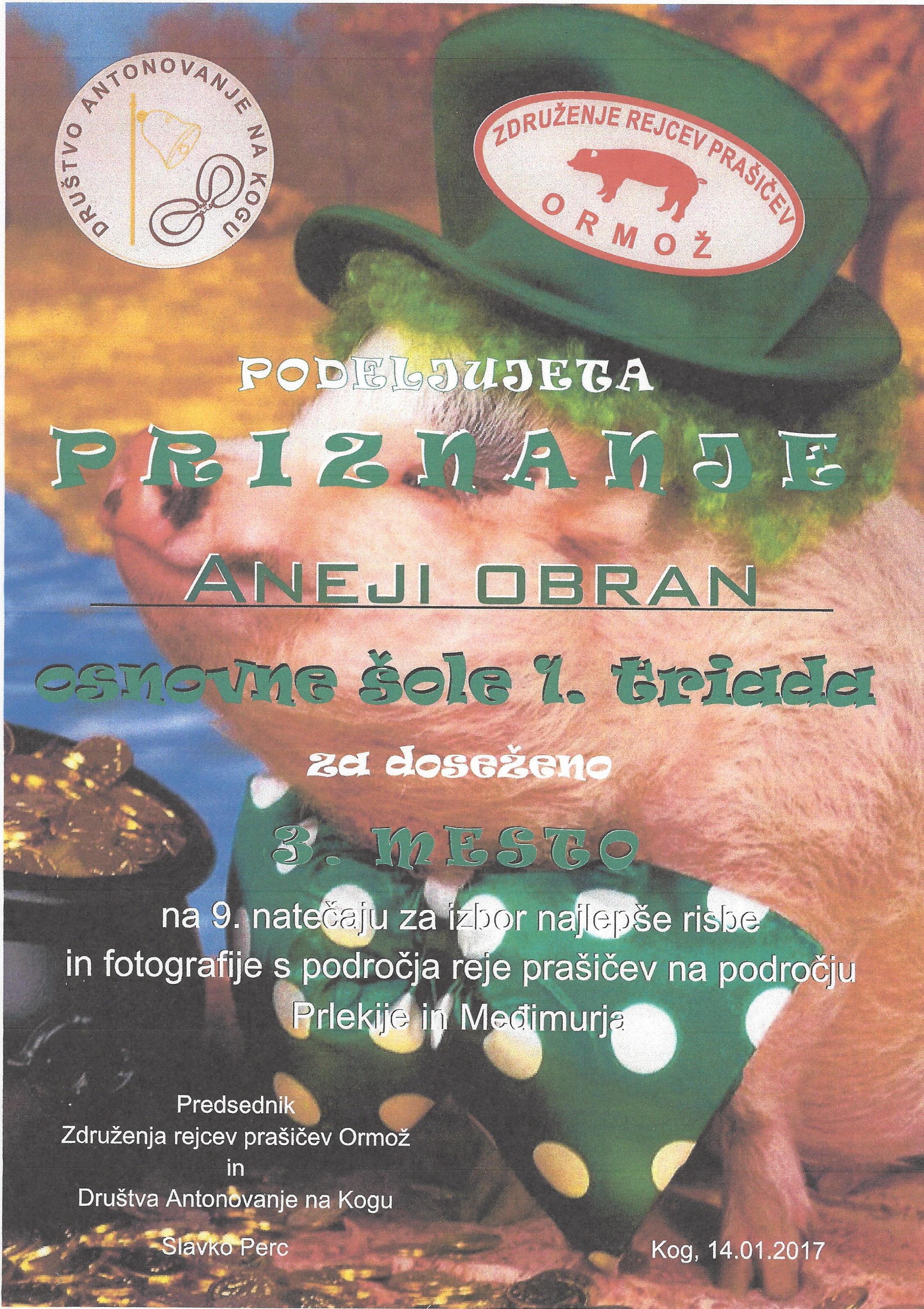 Med njimi je v kategoriji »Osnovne šole 1. triada« 3. mesto zasedla učenka 1. razreda ANEJA OBRAN za sliko pod naslovom »PUJS V BLATU«. Slika je nastala v jutranjem varstvu pod mentorstvom Štefanije Šalamija.