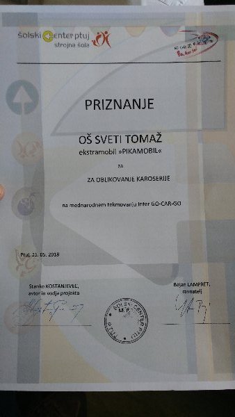 V torek, 15. 5. 2018, smo učenci 8. razreda izvedli tehniški dan. Udeležili smo se mednarodnega srečanja Go Car Go na Ptuju. Srečanja se je udeležilo 22 ekip osnovnh šol iz Slovenije, Hrvaške in Srbije. Naš avtomobil smo poimenovali Pikamobil. Učenci so vložili veliko truda pri izdelavi avtomobila. Tudi v soboto smo imeli delovni dan. Vsi avtomobili so bili lepi, domiselni, narejeni z veliko otroške domišljije in ustvarjalnosti. Naš avtomobil je dobil priznanje za konstrukcijsko rešitev izdelave karoserije. Pohvala učencem za delo in sodelovanje v projektu GoCarGo. Še posebej pa prejme pohvalo Žiga Miha, Marsel, Benjamin, Rene in Jernej.