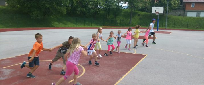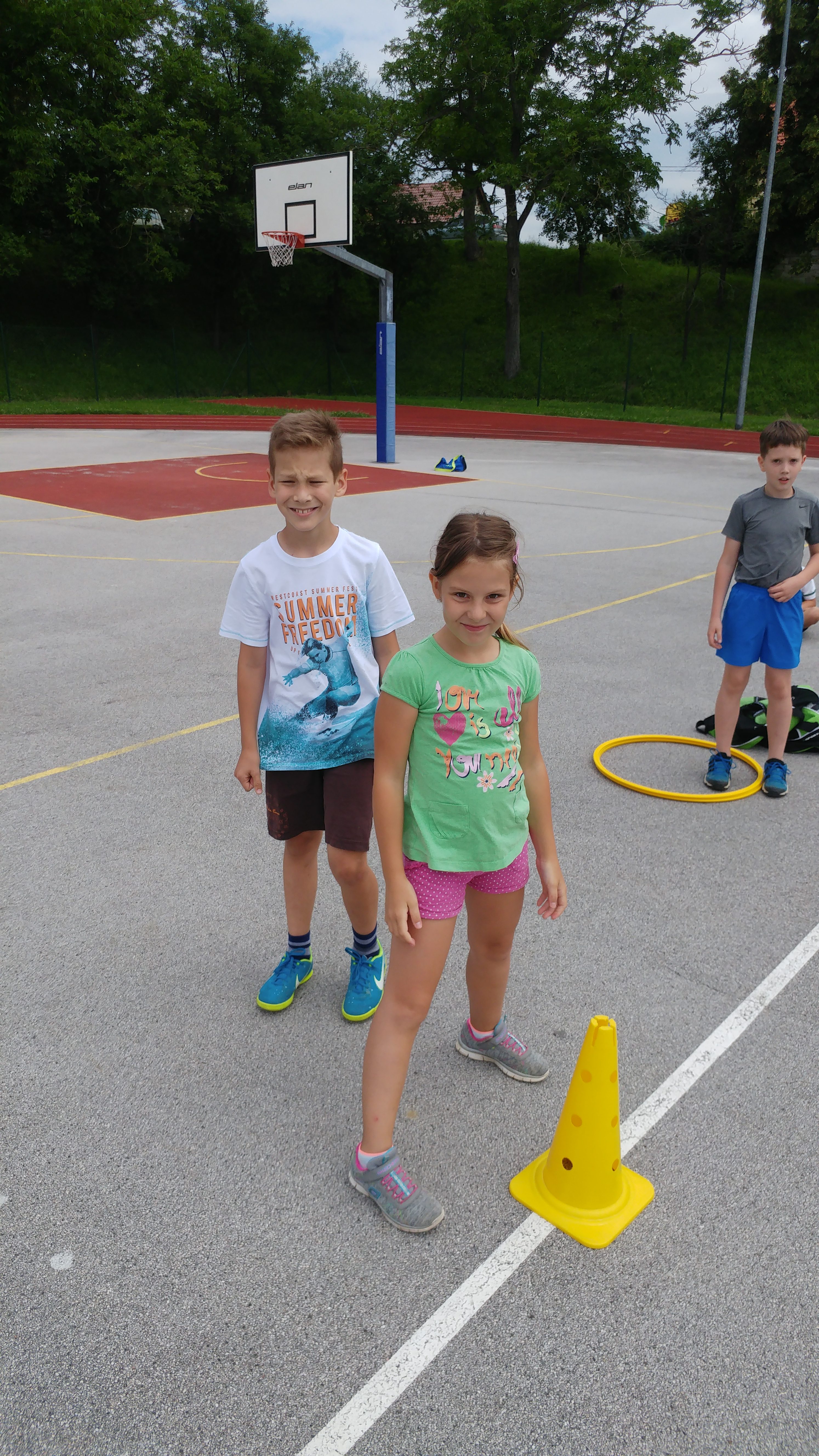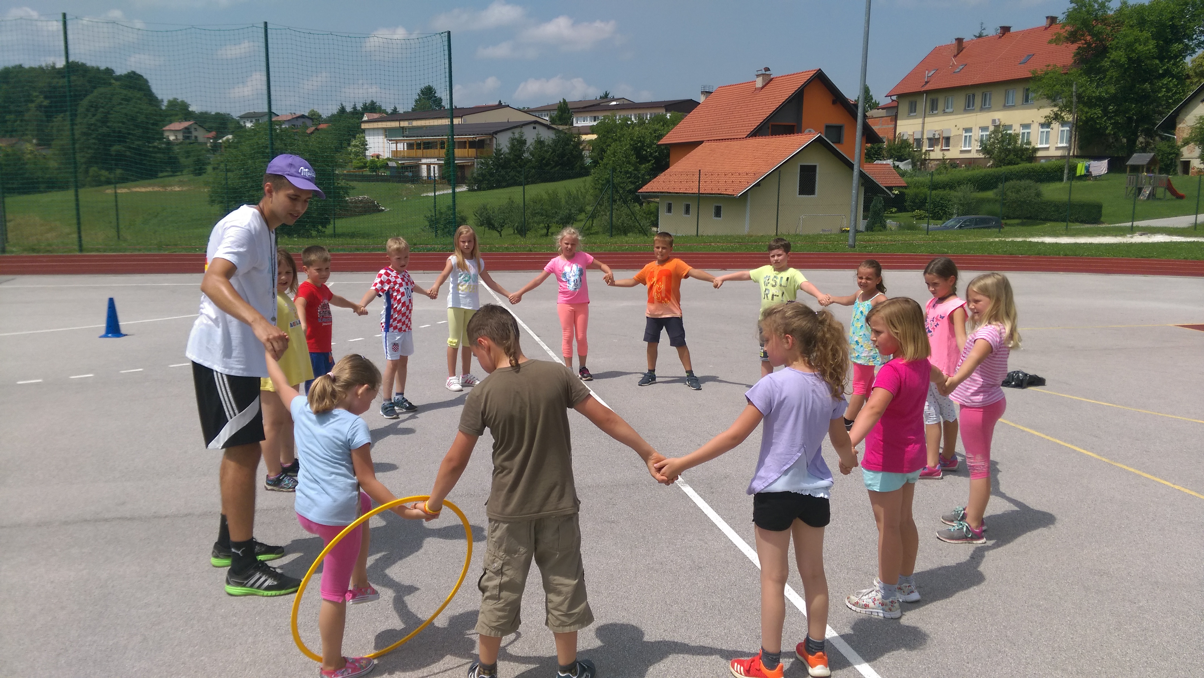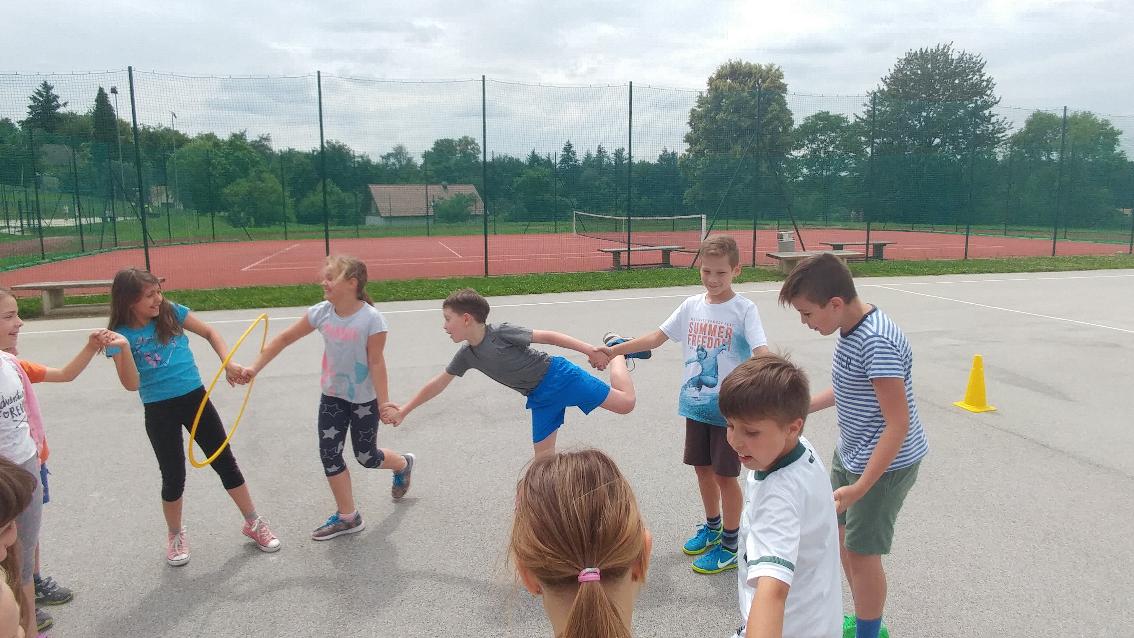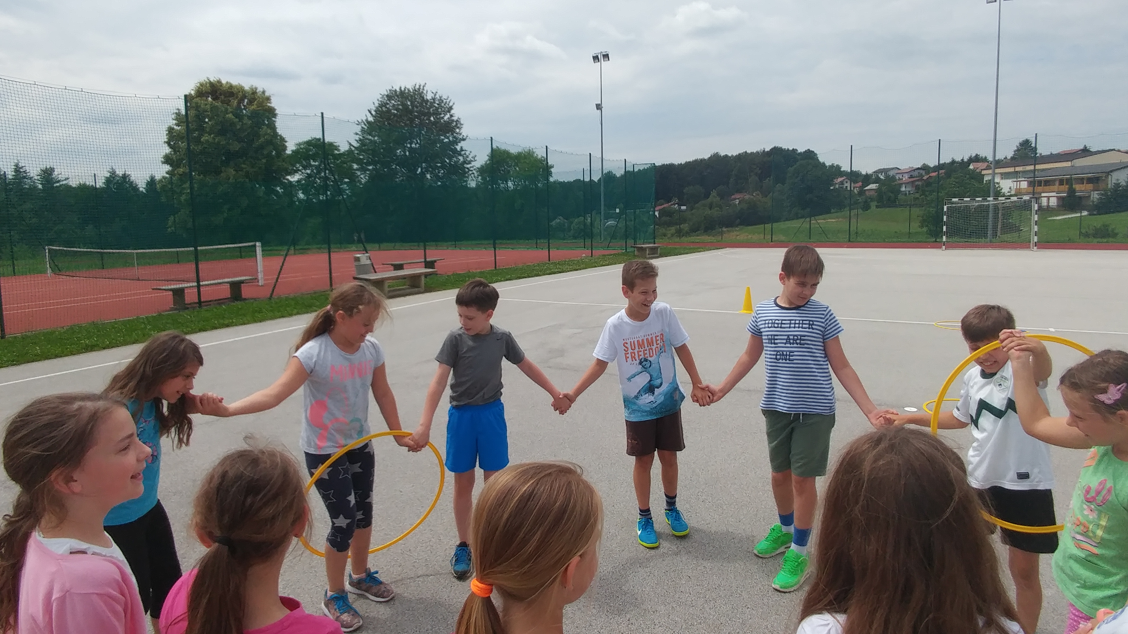 V petek, 8. 6. 2018, smo se z učenci prve skupine (1.-2. razred) zbrali na igrišču pri Svetem Tomažu in izvedli prvo brezplačno športno urico. Najprej smo se o projektu pogovorili, razdelili zbirne kartončke, s pomočjo katerih bodo učenci zbirali svoje obiske za prejem nagrad, in nato pričeli z gibalnimi dejavnostmi. Pričeli smo z igro lovljenja in razteznimi ter gimnastičnimi vajami, s pomočjo katerih smo poskrbeli za manjšo verjetnost poškodb. Nato smo oblikovali enakovredne skupine in pričeli s štafetnimi igrami, ki so vsebovale elemente tekov, poskokov in metov. Učenci so se pri igrah neizmerno zabavali, kar je jasno razvidno iz priloženih fotografij v galeriji. Po tem smo se sprostili in umirili z igro spretnosti premikanja skozi obroč. Čeprav je bilo zelo vroče, nas sončni žarki pri naši zabavi niso ovirali! Na koncu smo strnili svoje vrste in v en glas zavpili: “Rastemo s športom”.