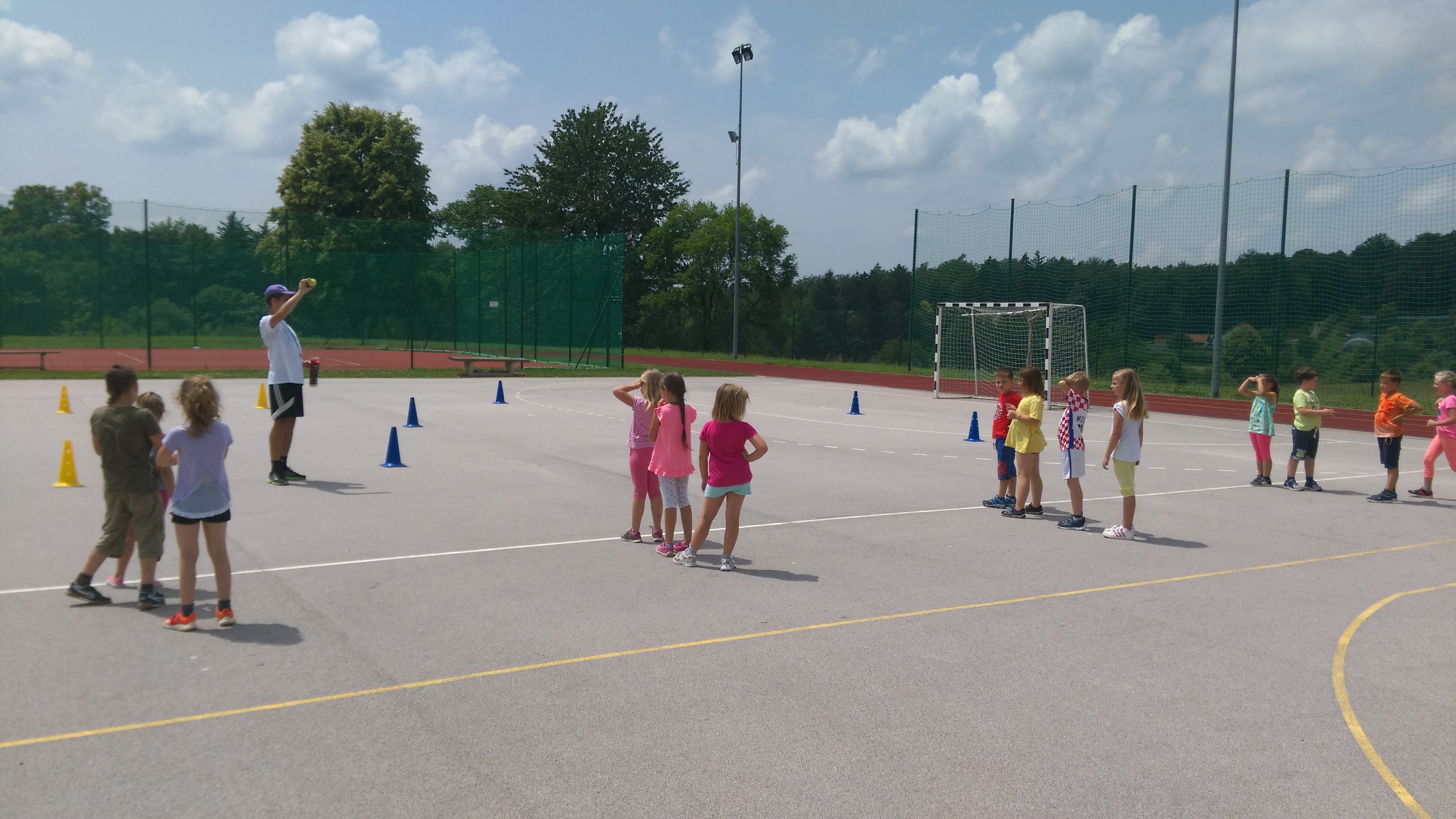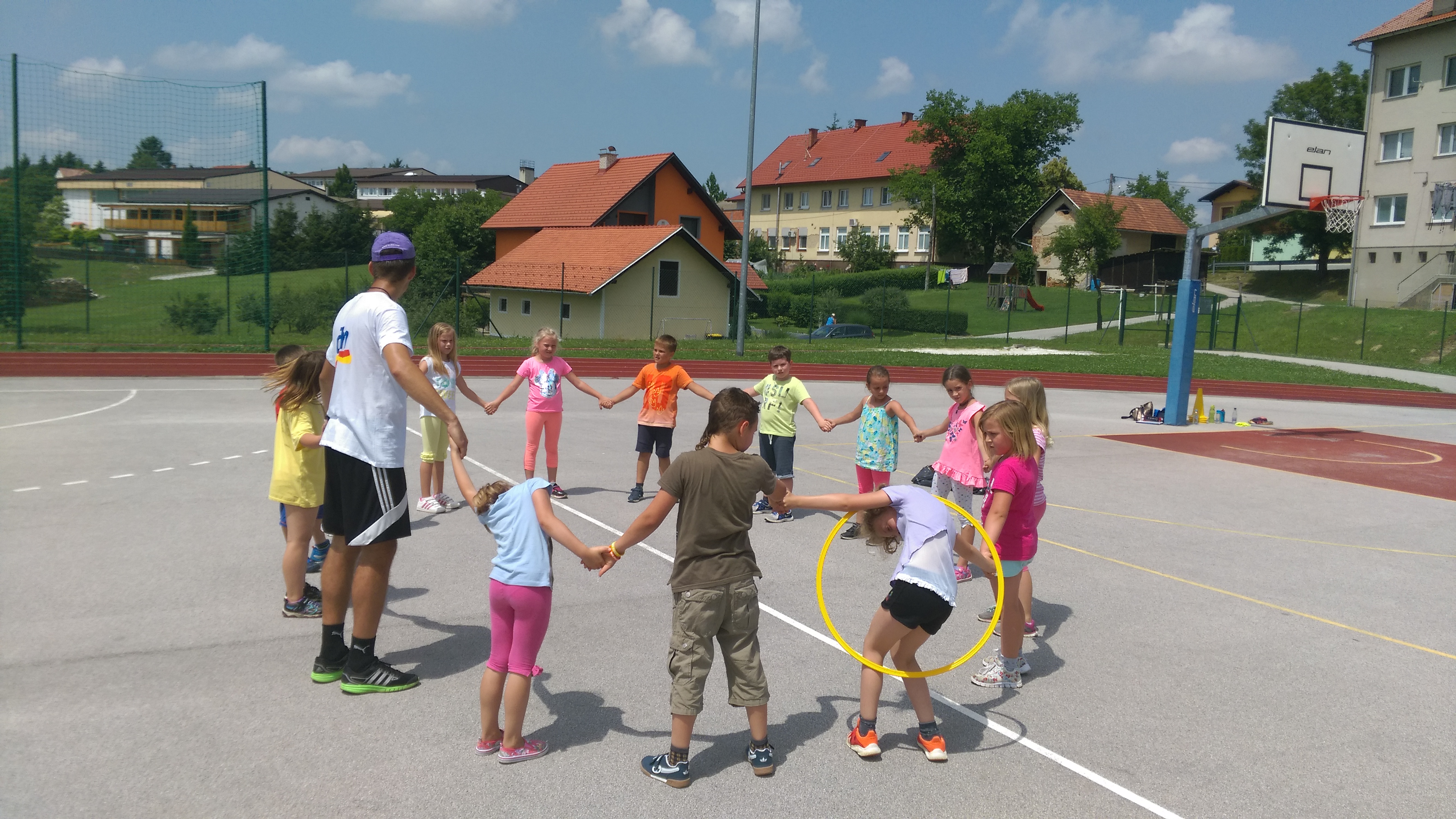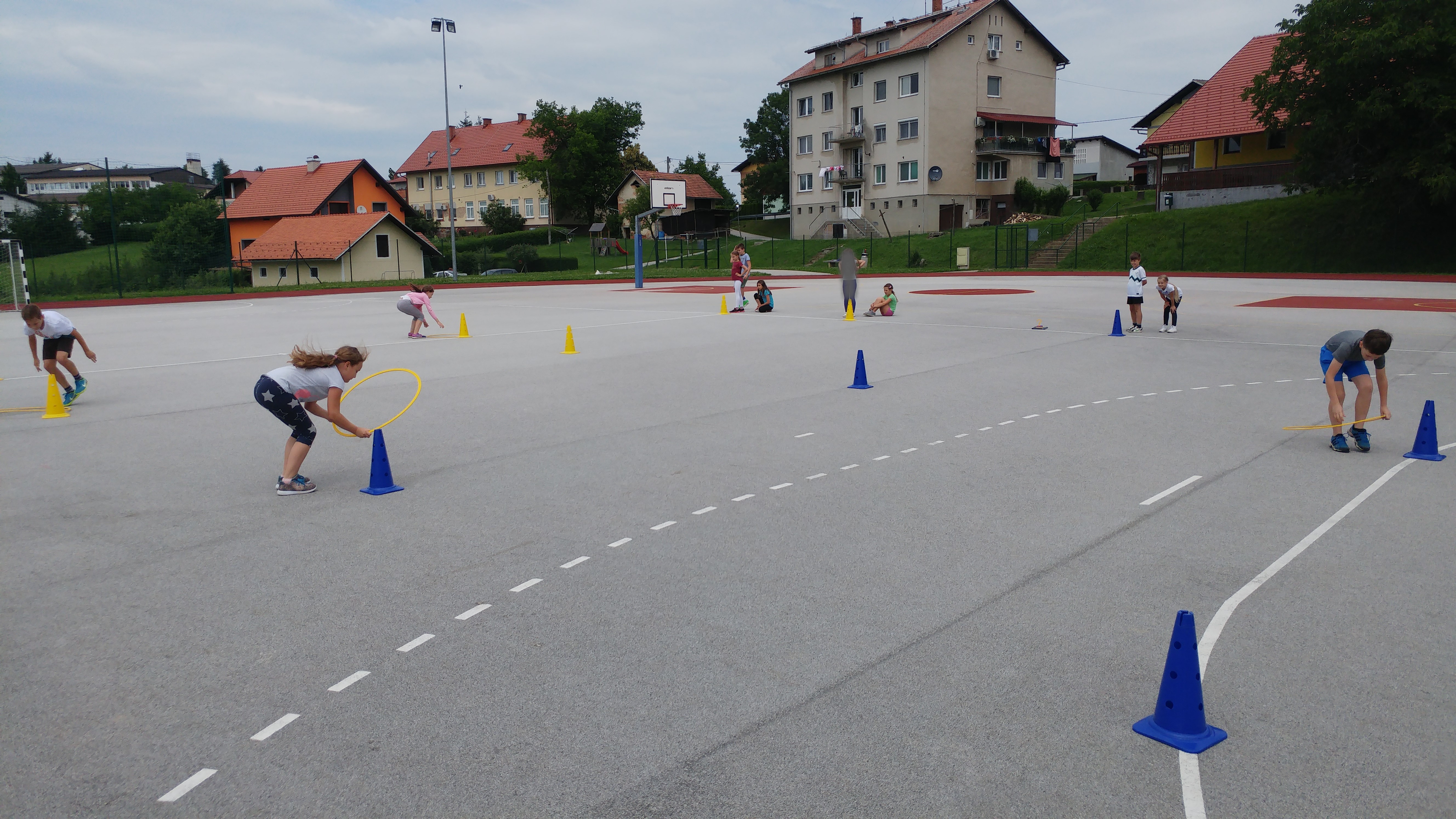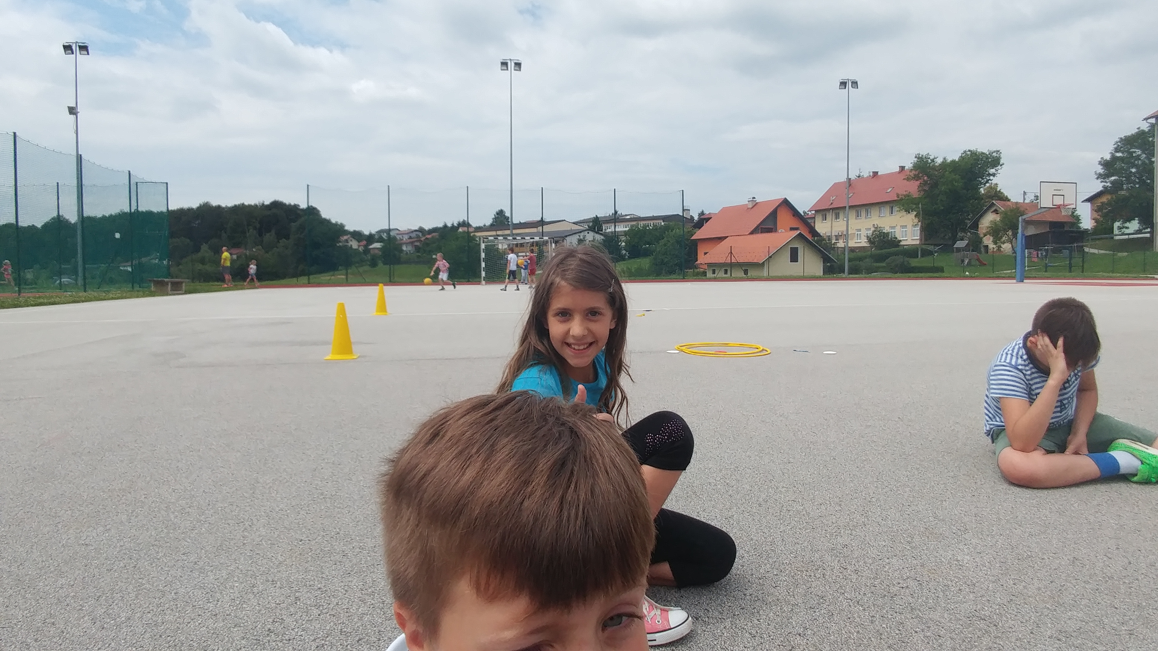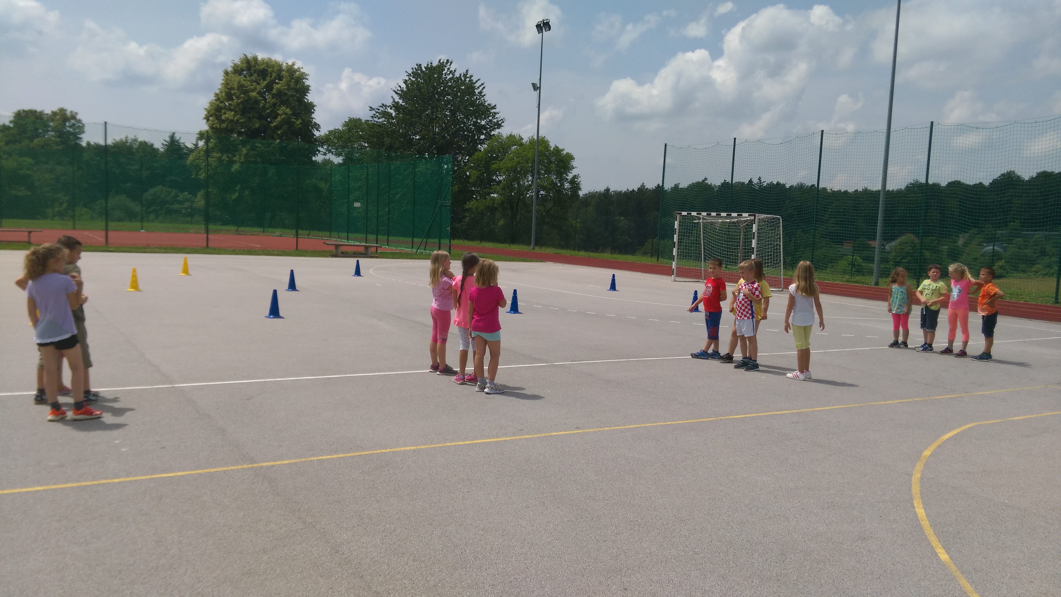V petek, 8. 6. 2018, smo se z učenci prve skupine (1.-2. razred) zbrali na igrišču pri Svetem Tomažu in izvedli prvo brezplačno športno urico. Najprej smo se o projektu pogovorili, razdelili zbirne kartončke, s pomočjo katerih bodo učenci zbirali svoje obiske za prejem nagrad, in nato pričeli z gibalnimi dejavnostmi. Pričeli smo z igro lovljenja in razteznimi ter gimnastičnimi vajami, s pomočjo katerih smo poskrbeli za manjšo verjetnost poškodb. Nato smo oblikovali enakovredne skupine in pričeli s štafetnimi igrami, ki so vsebovale elemente tekov, poskokov in metov. Učenci so se pri igrah neizmerno zabavali, kar je jasno razvidno iz priloženih fotografij v galeriji. Po tem smo se sprostili in umirili z igro spretnosti premikanja skozi obroč. Čeprav je bilo zelo vroče, nas sončni žarki pri naši zabavi niso ovirali! Na koncu smo strnili svoje vrste in v en glas zavpili: “Rastemo s športom”.