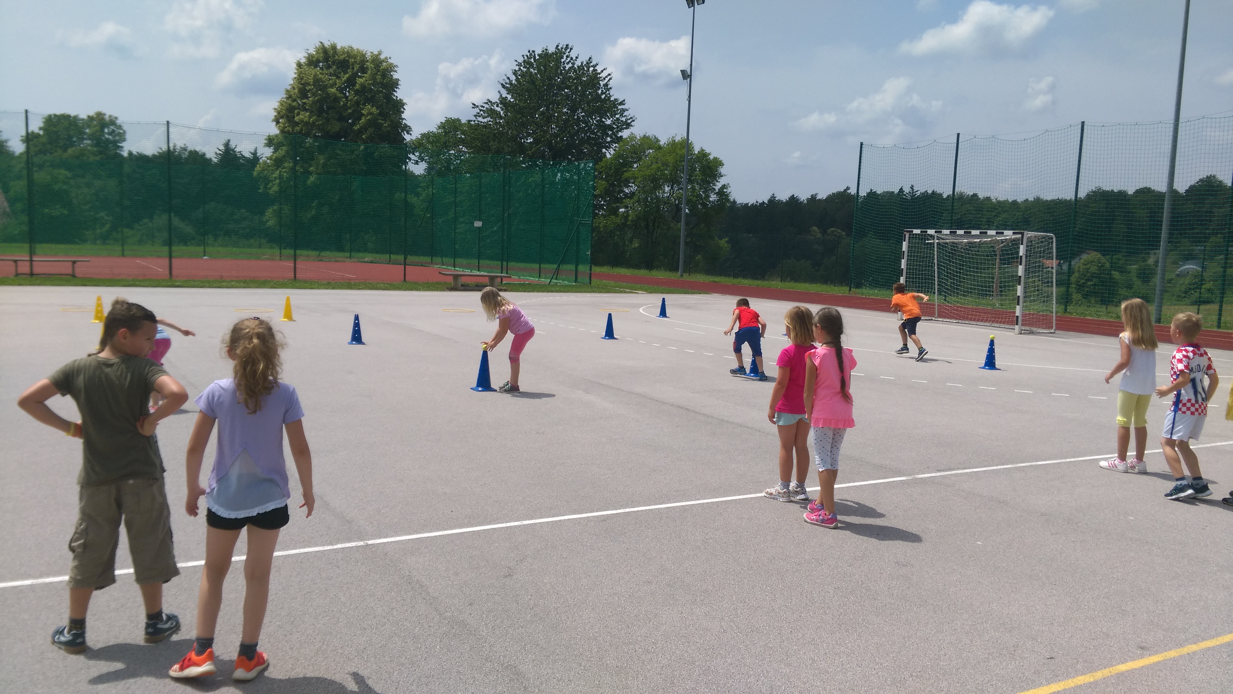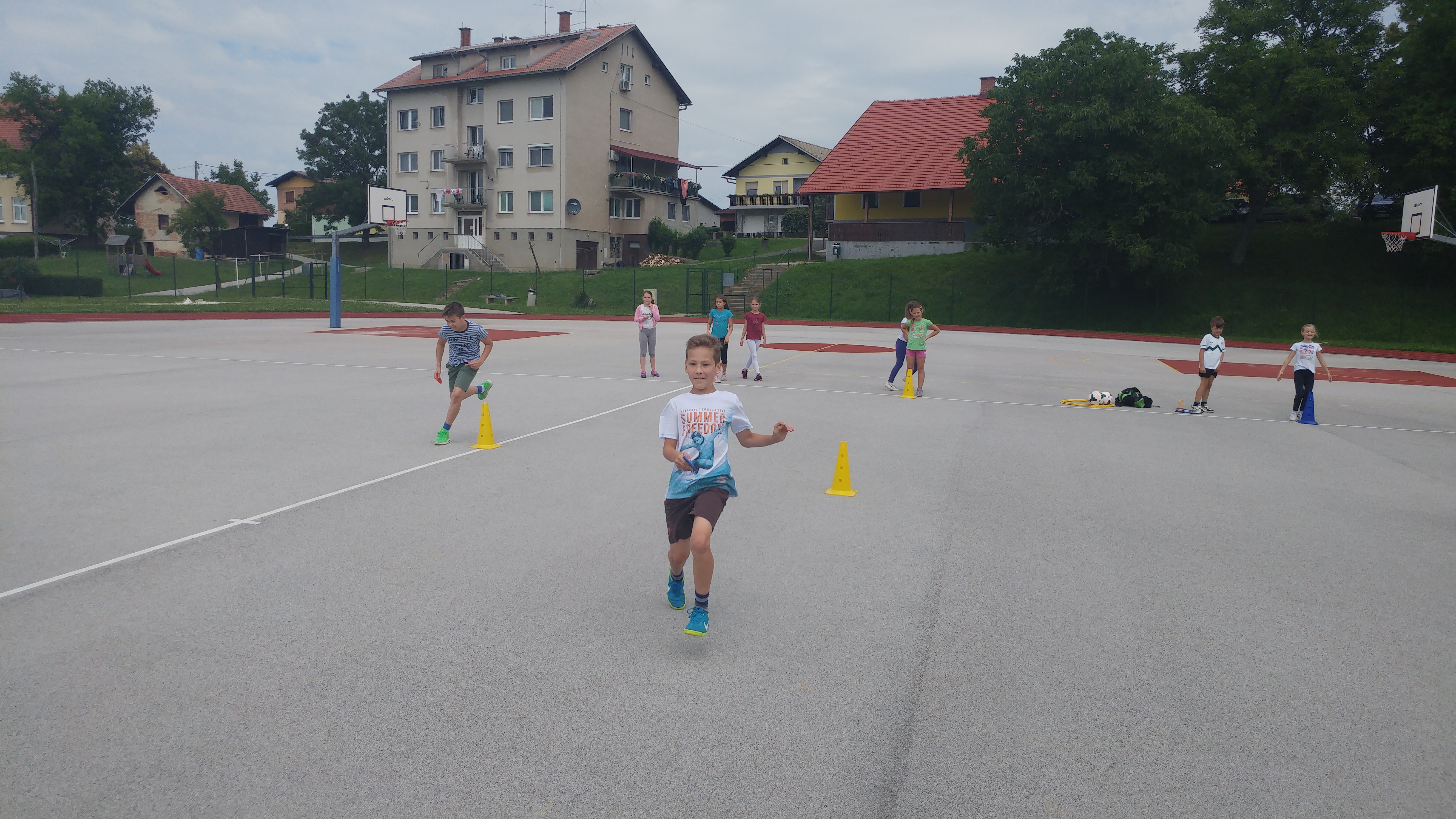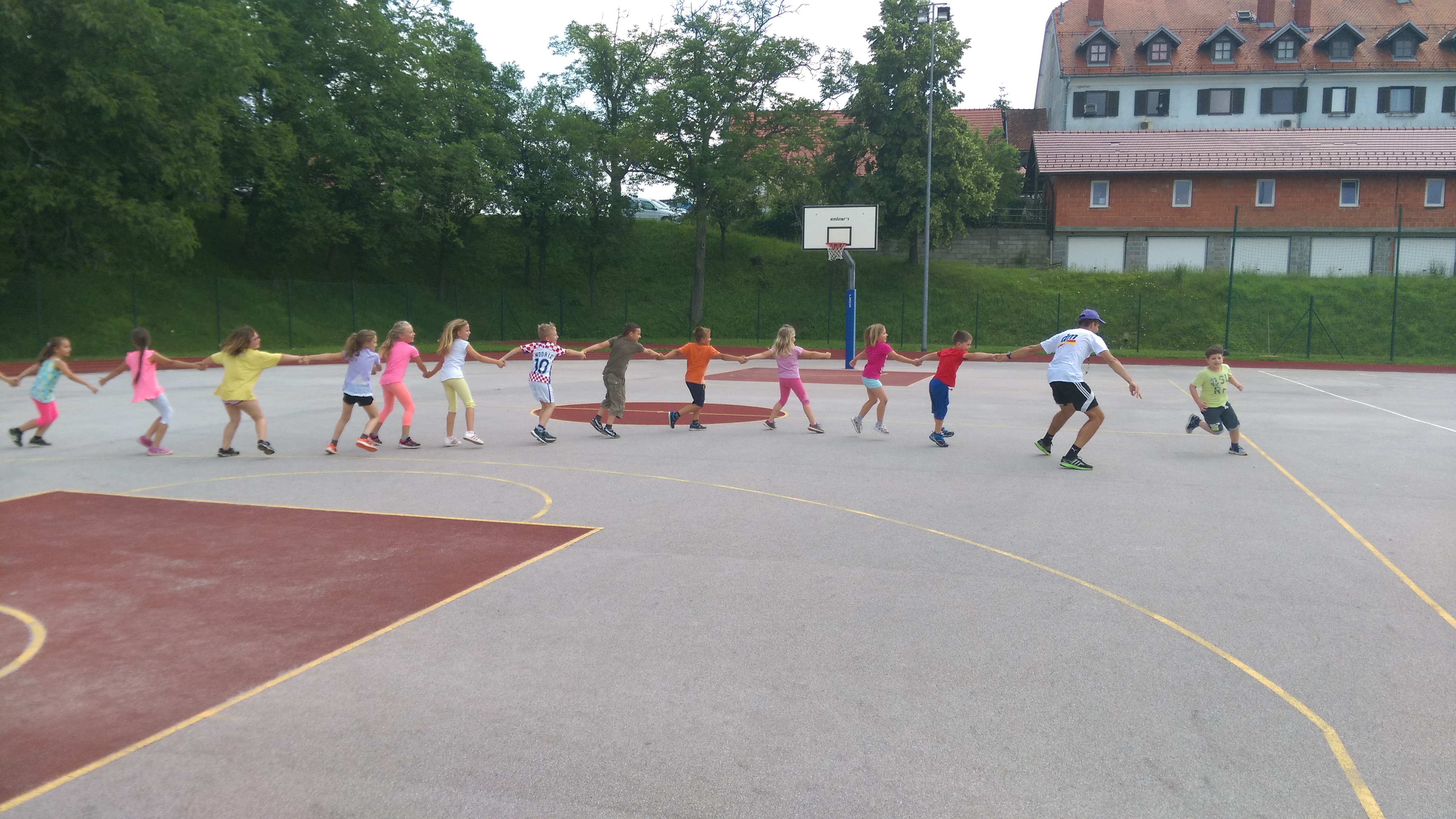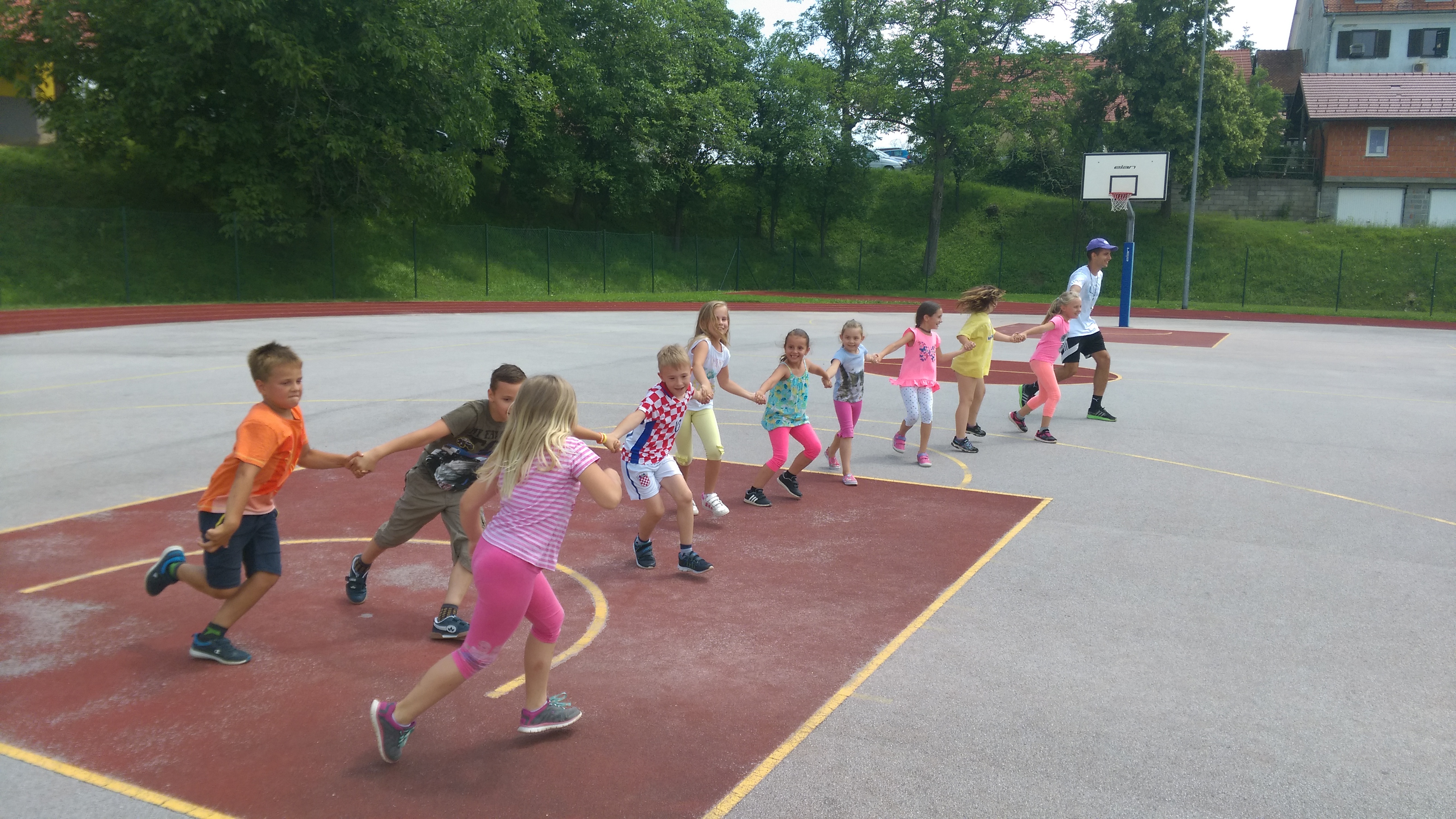 V petek, 8. 6. 2018, smo se z učenci prve skupine (1.-2. razred) zbrali na igrišču pri Svetem Tomažu in izvedli prvo brezplačno športno urico. Najprej smo se o projektu pogovorili, razdelili zbirne kartončke, s pomočjo katerih bodo učenci zbirali svoje obiske za prejem nagrad, in nato pričeli z gibalnimi dejavnostmi. Pričeli smo z igro lovljenja in razteznimi ter gimnastičnimi vajami, s pomočjo katerih smo poskrbeli za manjšo verjetnost poškodb. Nato smo oblikovali enakovredne skupine in pričeli s štafetnimi igrami, ki so vsebovale elemente tekov, poskokov in metov. Učenci so se pri igrah neizmerno zabavali, kar je jasno razvidno iz priloženih fotografij v galeriji. Po tem smo se sprostili in umirili z igro spretnosti premikanja skozi obroč. Čeprav je bilo zelo vroče, nas sončni žarki pri naši zabavi niso ovirali! Na koncu smo strnili svoje vrste in v en glas zavpili: “Rastemo s športom”.