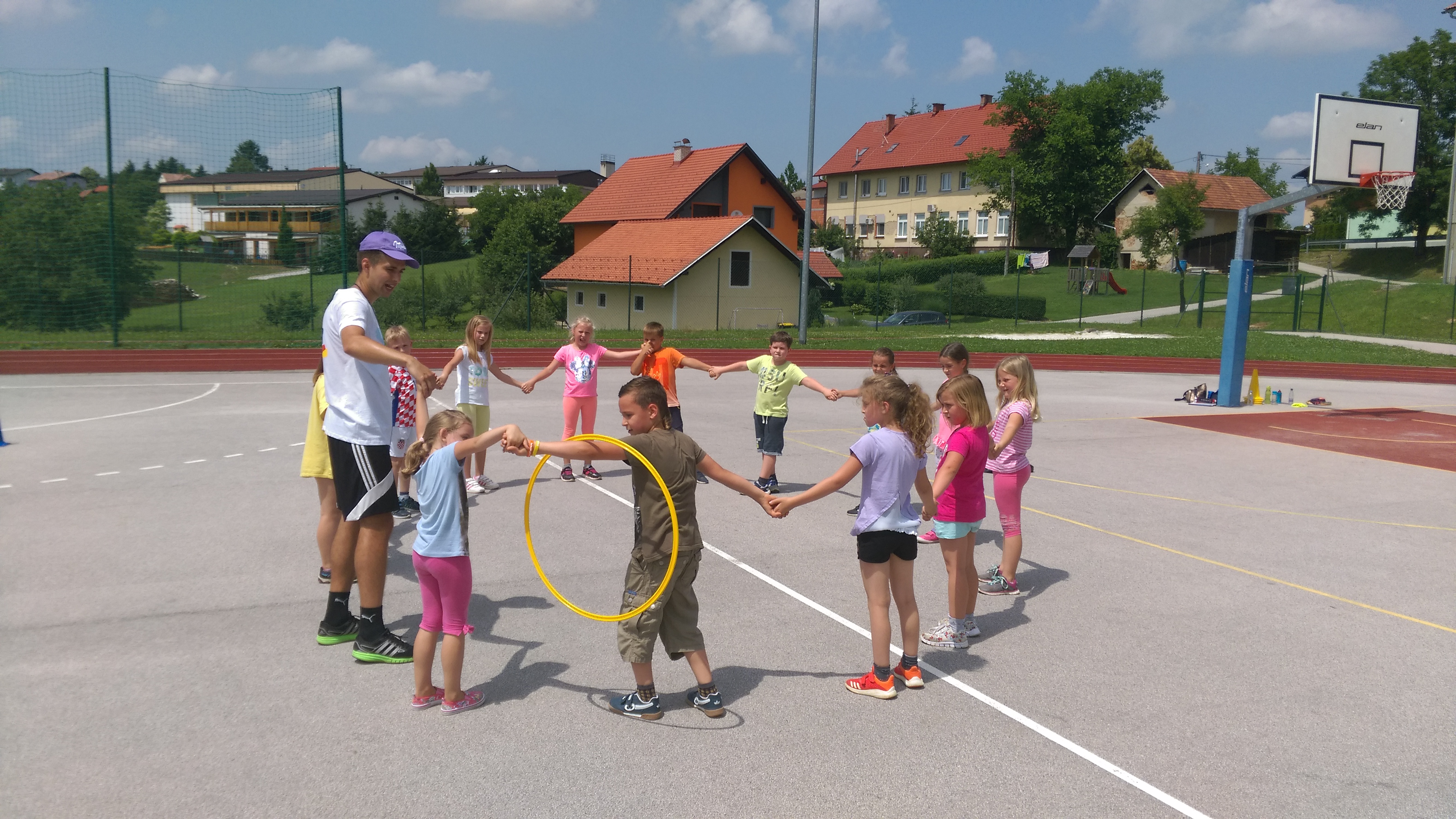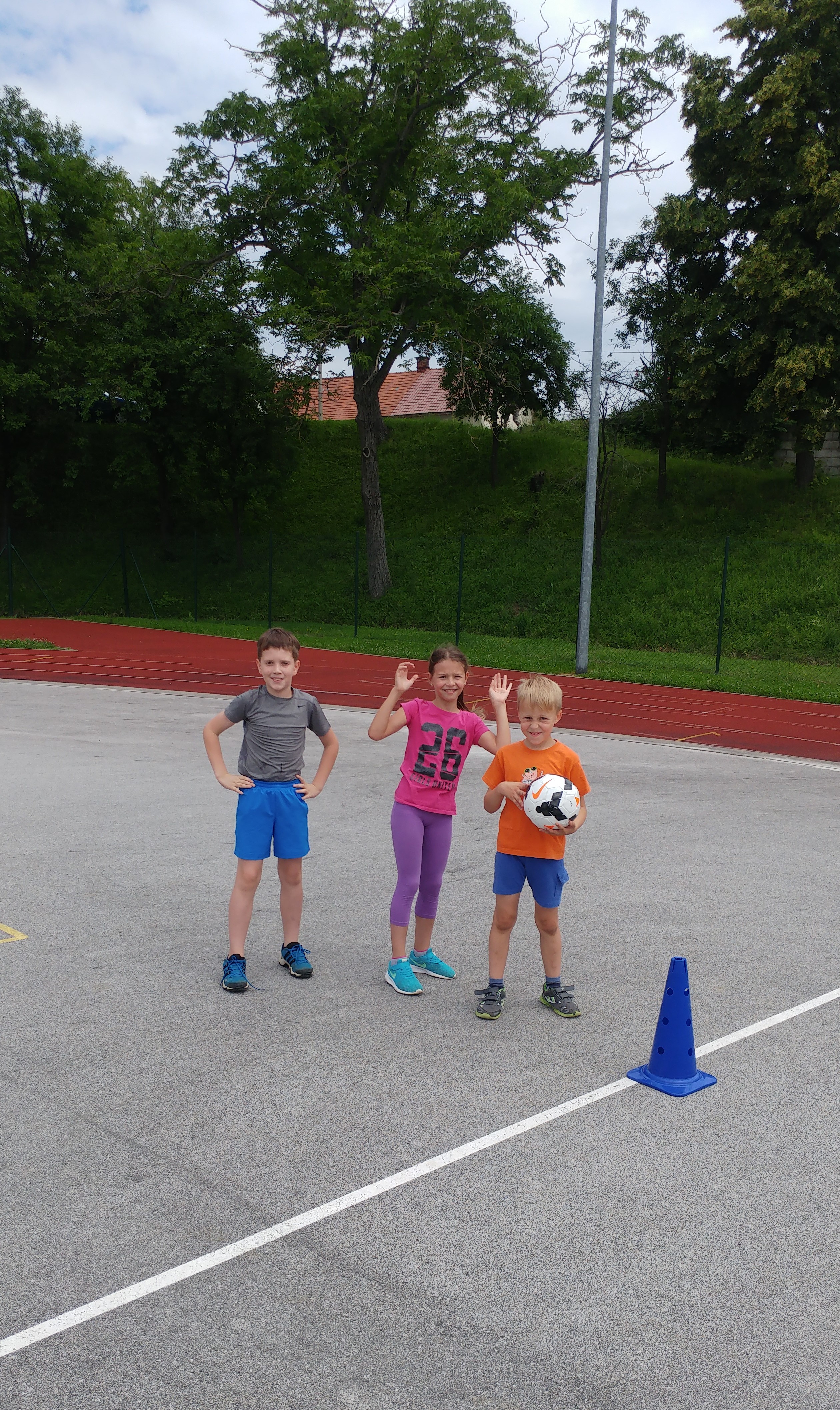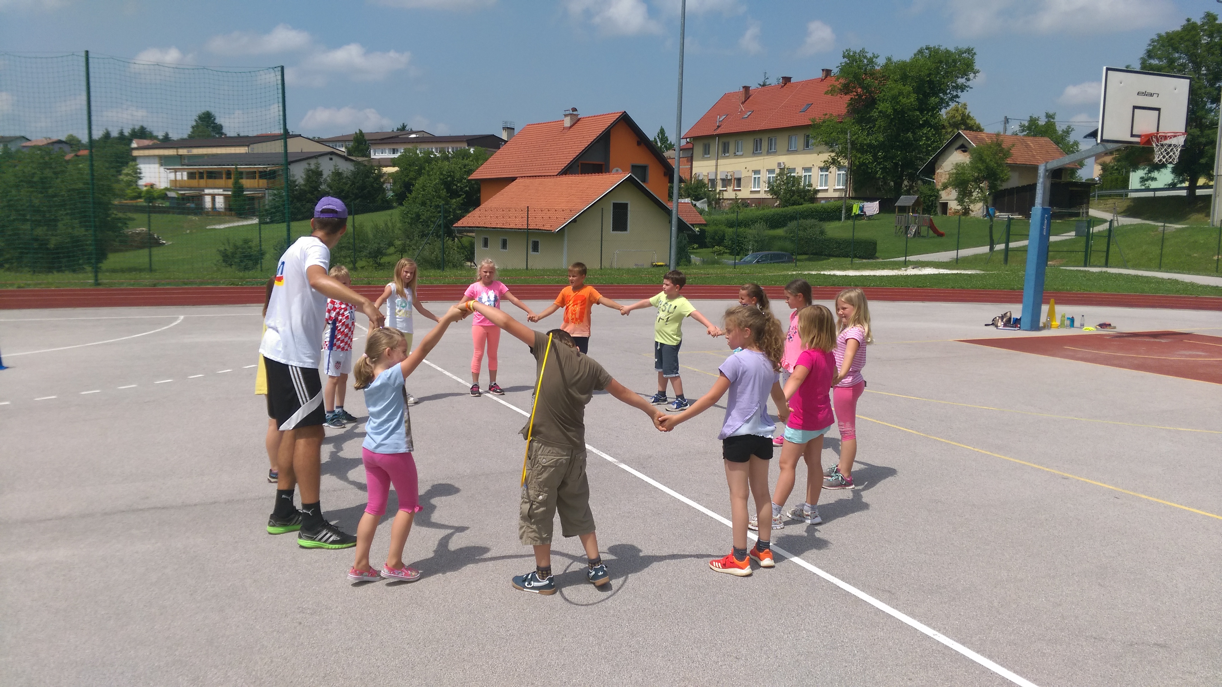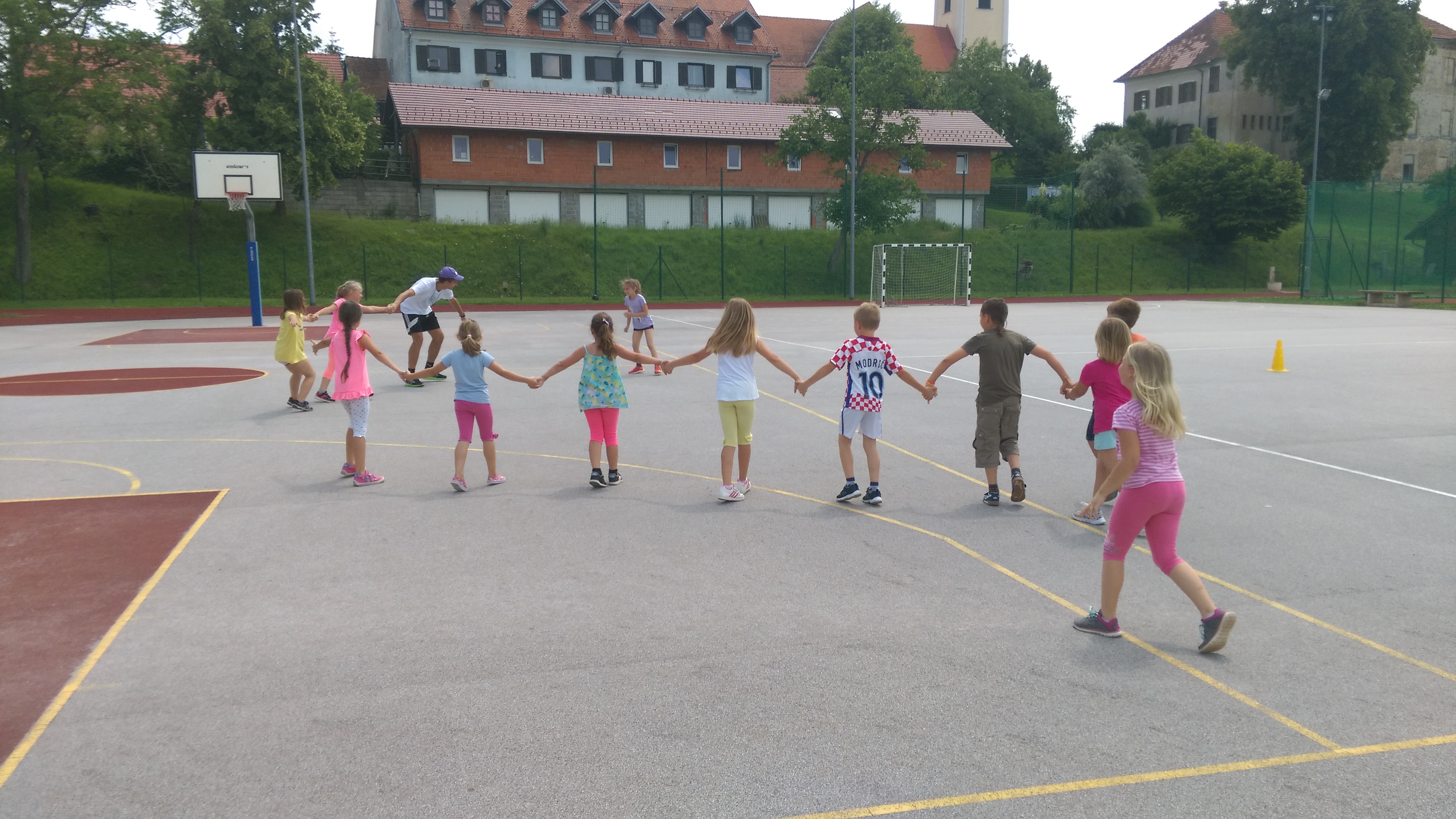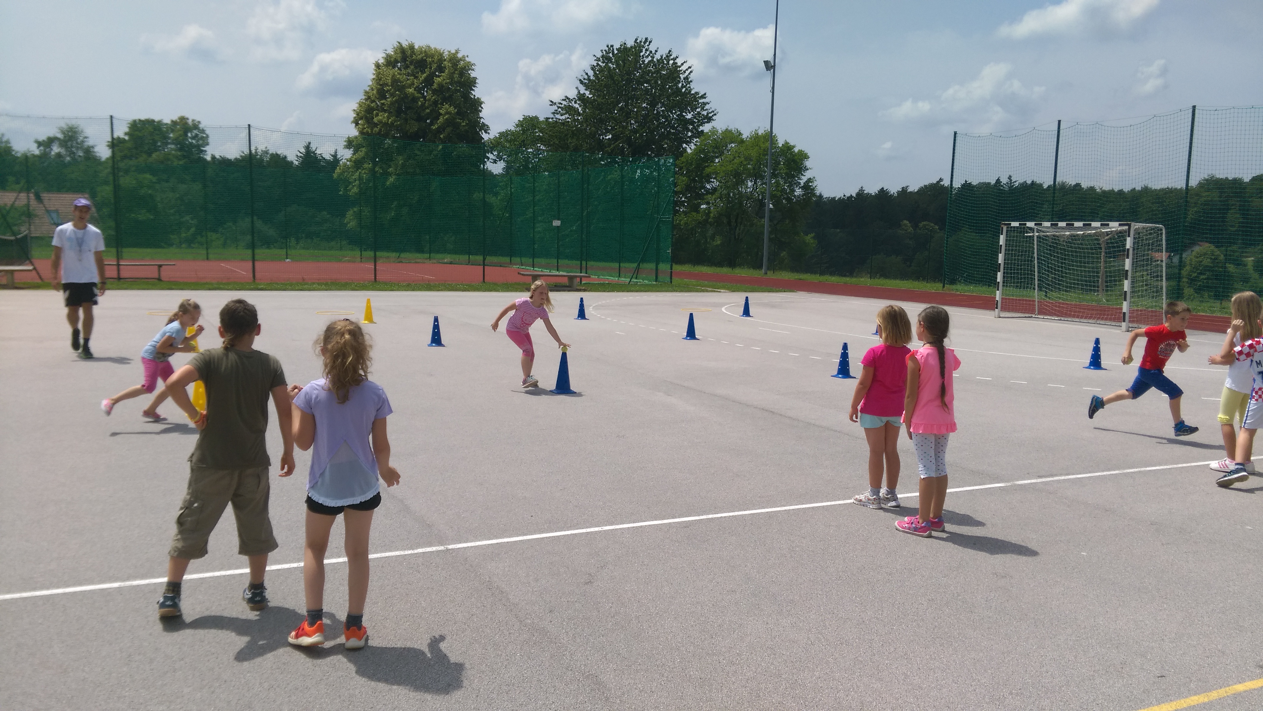 V petek, 8. 6. 2018, smo se z učenci prve skupine (1.-2. razred) zbrali na igrišču pri Svetem Tomažu in izvedli prvo brezplačno športno urico. Najprej smo se o projektu pogovorili, razdelili zbirne kartončke, s pomočjo katerih bodo učenci zbirali svoje obiske za prejem nagrad, in nato pričeli z gibalnimi dejavnostmi. Pričeli smo z igro lovljenja in razteznimi ter gimnastičnimi vajami, s pomočjo katerih smo poskrbeli za manjšo verjetnost poškodb. Nato smo oblikovali enakovredne skupine in pričeli s štafetnimi igrami, ki so vsebovale elemente tekov, poskokov in metov. Učenci so se pri igrah neizmerno zabavali, kar je jasno razvidno iz priloženih fotografij v galeriji. Po tem smo se sprostili in umirili z igro spretnosti premikanja skozi obroč. Čeprav je bilo zelo vroče, nas sončni žarki pri naši zabavi niso ovirali! Na koncu smo strnili svoje vrste in v en glas zavpili: “Rastemo s športom”.