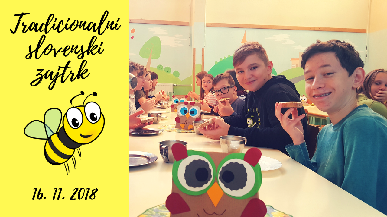 V petek, 16. novembra, že tradicionalno obeležujemo Dan slovenske hrane in tako ob tej priložnosti vsi učenci in otroci zajtrkujejo živila, ki so pridelana v Sloveniji. Zajtrk je sestavljen iz kruha, mleka, masla, medu in jabolk.