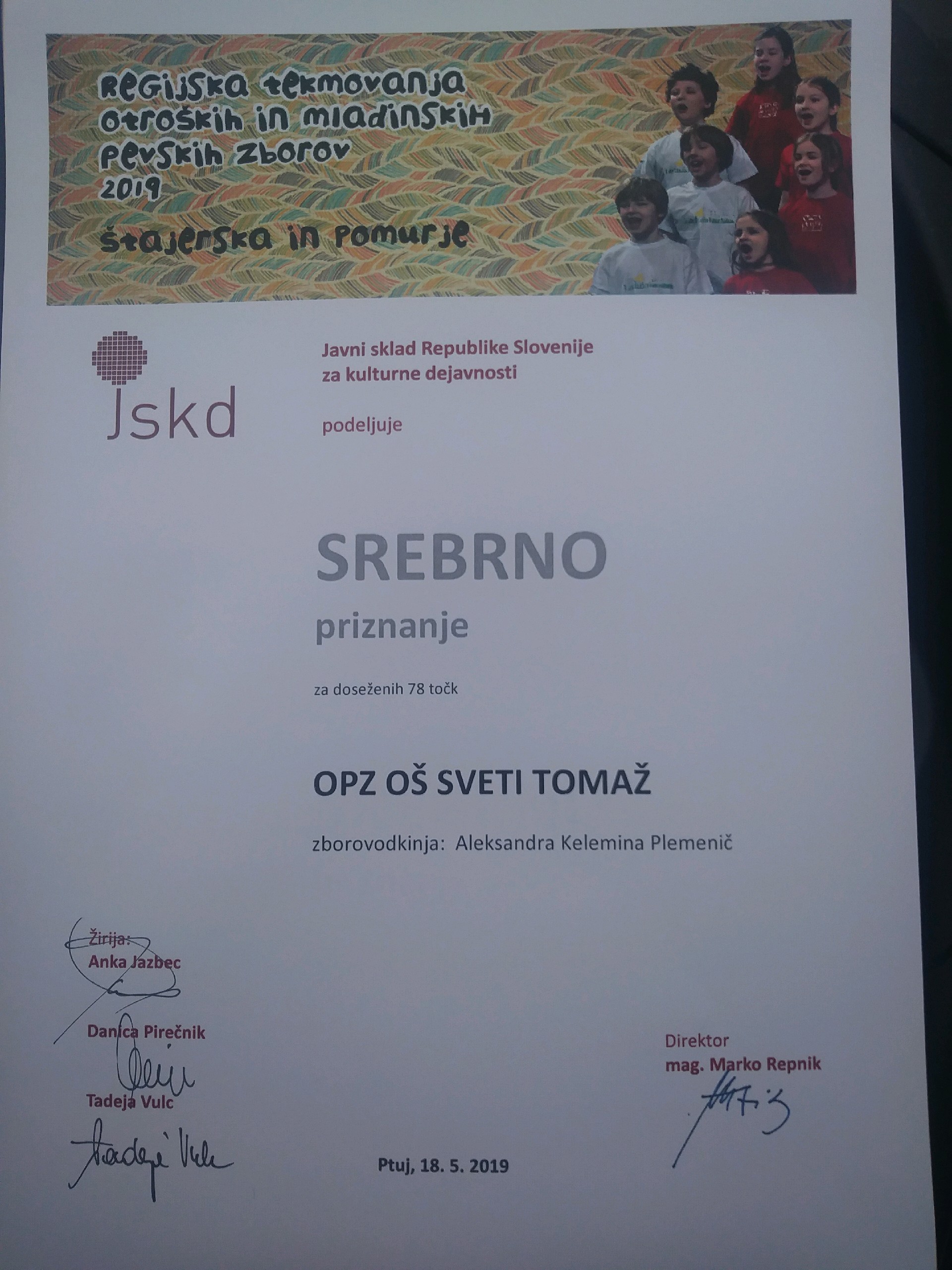 V soboto, 18. 5. 2019, so se mladi pevci OPZ OŠ Sveti Tomaž udeležili regijskega tekmovanja na Ptuju.