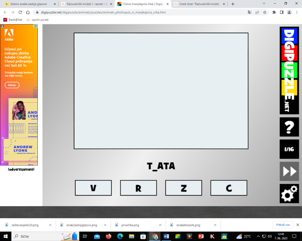 Kaj se skriva. Pritisni pravo črko in odkrij sliko. Igra se nahaja na tej povezavi