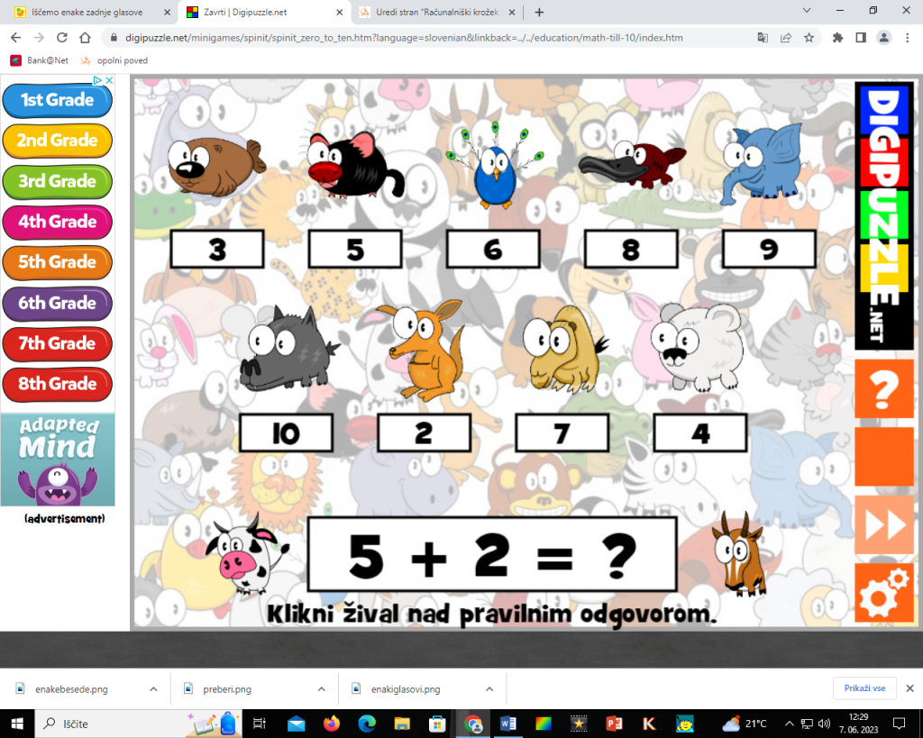 Seštevanje do 10. Igra se nahaja tukaj.