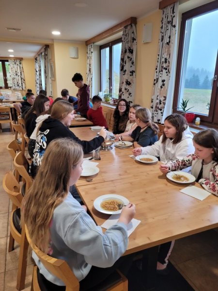 Danes smo prišli v Ribnico na Pohorju z avtobusom. Za kosilo smo jedli juho, dunajski zrezek, krompir in solato. Po kosilu smo imeli dolg odmor. V odmoru smo se veliko zabavali. Za večerjo smo jedli špagete. (Aljaž Prelogar)
