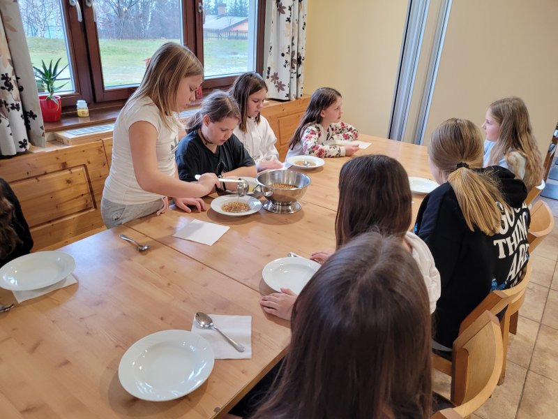 Danes smo prišli v Ribnico na Pohorju z avtobusom. Za kosilo smo jedli juho, dunajski zrezek, krompir in solato. Po kosilu smo imeli dolg odmor. V odmoru smo se veliko zabavali. Za večerjo smo jedli špagete. (Aljaž Prelogar)