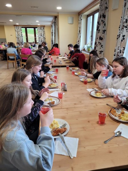Danes smo prišli v Ribnico na Pohorju z avtobusom. Za kosilo smo jedli juho, dunajski zrezek, krompir in solato. Po kosilu smo imeli dolg odmor. V odmoru smo se veliko zabavali. Za večerjo smo jedli špagete. (Aljaž Prelogar)
