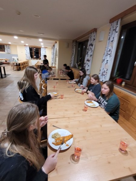 Danes, 10. 1. 2023, smo se ob sedmih zbudili in oblekli. Odšli smo na zajtrk in se oblekli za smučanje. Smučali smo uro in pol in nato odšli na čaj. Potem smo še smučali. Ko smo se preoblekli, smo imeli sestanek za tehniko in pričeli z izdelavo klopi. Nato smo imeli večerjo. (Vito Vučina)