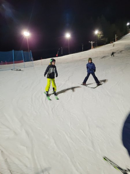 Zvečer nas čaka nočna smuka! Zato vam sporočamo, da se vam bomo danes oglasili šele po 20. uri. Mama in ata – naj vaju nič ne skrbi! Danes je bilo veliko padcev in veliko smeha, predvsem pa se vsi veselimo našega napredka! Se slišimo po nočni smuki!