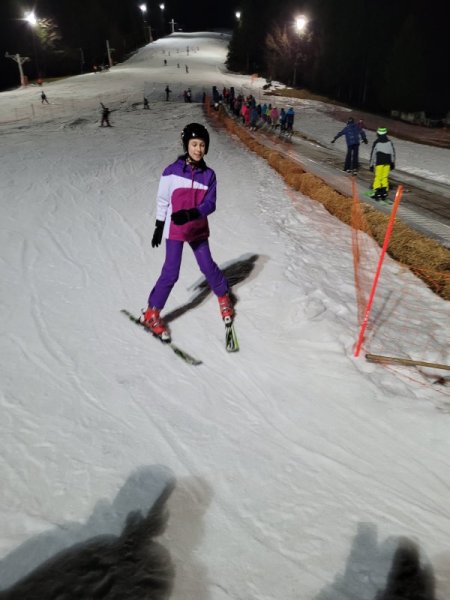 Danes smo imeli velike načrte. Na smučišču smo bili že zelo hitro, saj smo želeli obnoviti in nadgraditi naše znanje. Tudi po kosilu je bilo malo počitka, saj smo smučali že od 13. ure dalje – takrat je smučišče prazno in imeli smo ga čisto, čisto zase.