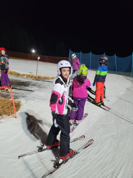 Zvečer nas čaka nočna smuka! Zato vam sporočamo, da se vam bomo danes oglasili šele po 20. uri. Mama in ata – naj vaju nič ne skrbi! Danes je bilo veliko padcev in veliko smeha, predvsem pa se vsi veselimo našega napredka! Se slišimo po nočni smuki!