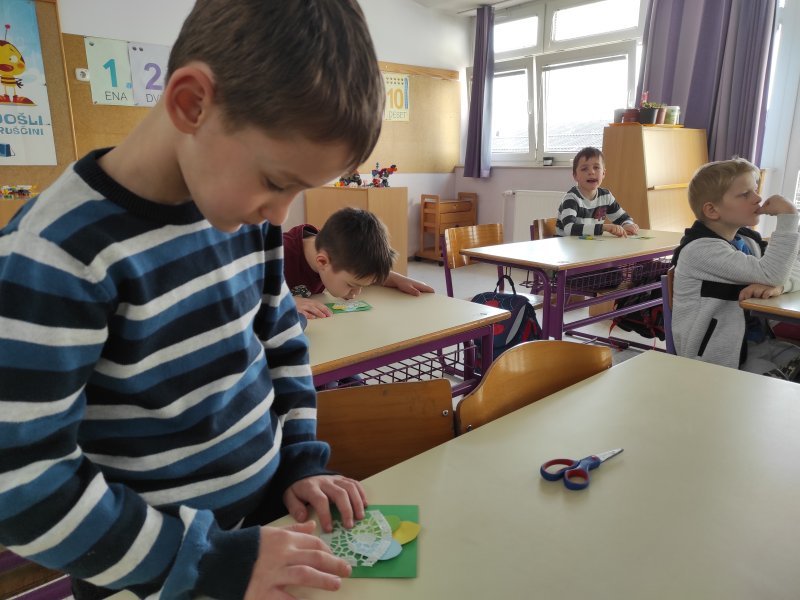 Ustvarjalne delavnice imajo učenci še posebej radi. Danes so ustvarjali z različnimi materiali. Nekatere materiale smo uporabili že večkrat. Pogovarjali smo se tudi o tem. Prisluhnili so pravljici Mandi, velikonočni zajček.