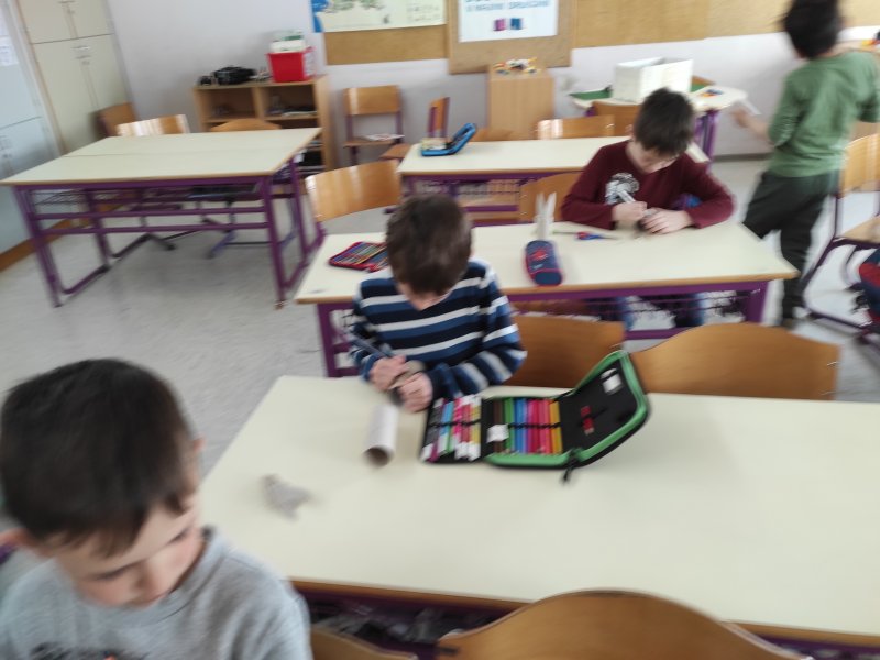 Ustvarjalne delavnice imajo učenci še posebej radi. Danes so ustvarjali z različnimi materiali. Nekatere materiale smo uporabili že večkrat. Pogovarjali smo se tudi o tem. Prisluhnili so pravljici Mandi, velikonočni zajček.