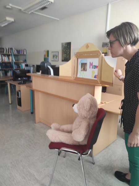 Ob kratki predstavitvi knjige so učenci uživali. Sledila je tudi pravljica uprizorjena s kamišibajem z naslovom MEDVEDEK RADOVEDEK.