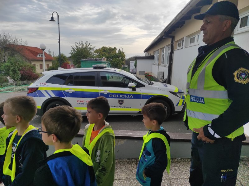 Obiskal nas je policist Aleš Meško. Učence je popeljal po varni poti v okolici šole. Dal jim je napotke v zvezi z varnostnim pasom pri vožnji z avtom in avtobusom.