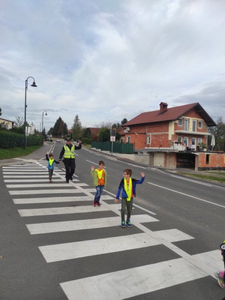 Obiskal nas je policist Aleš Meško. Učence je popeljal po varni poti v okolici šole. Dal jim je napotke v zvezi z varnostnim pasom pri vožnji z avtom in avtobusom.
