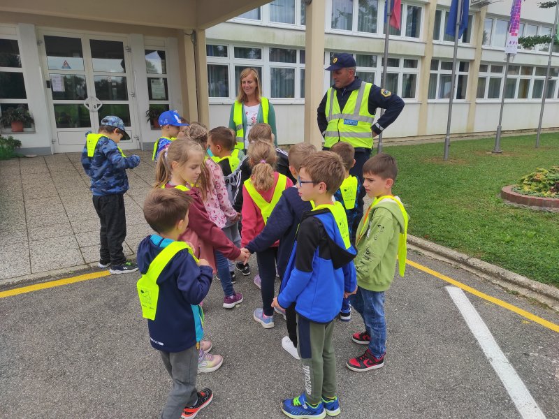 Obiskal nas je policist Aleš Meško. Učence je popeljal po varni poti v okolici šole. Dal jim je napotke v zvezi z varnostnim pasom pri vožnji z avtom in avtobusom.