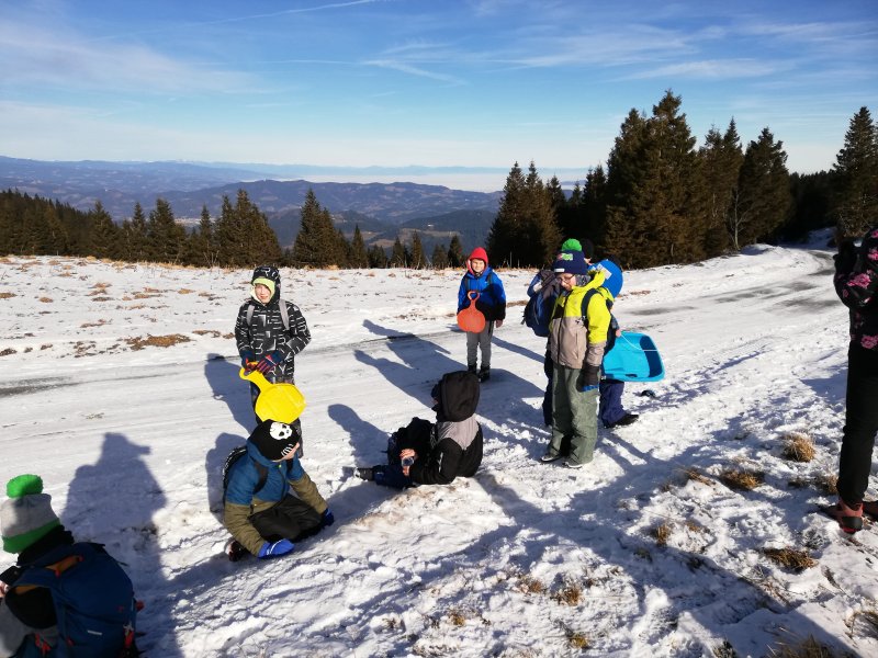 Z avtobusom smo se iz Sv. Tomaža odpeljali do Ribnice na Pohorju in Koče Pesnik ter nato peš nadaljevali pot do Ribniške koče na višini 1507 m, kjer smo se okrepčali in popili topel čaj. Povzpeli smo se še na Ribniški ali Jezerski vrh, ki meri 1537 m in je med najvišjimi pohorskimi vrhovi. Je približno 15 minut oddaljen od Ribniške koče. Na vrhu, ki ni poraščen z gozdom, je lep razgled po Pohorju. Na vrhu stoji visok spomenik, ki je posvečen padlim planincem. Sprehodili smo se do slikovitega Ribniškega jezera, ki leži tik pod Ribniškim vrhom in ni pravo jezero, ampak šotno barje. Ob njem je šest manjših jezerc ali »barjanskih oken«. Jezero  je pomembna naravna znamenitost Pohorja. Najbolj smo uživali v vožnji z »lopatkami« po hribu. Hodili smo približno 4 ure. Vreme je bilo toplo za ta čas, a se je hitro spreminjalo. Oglejte si nekaj utrinkov z naše poti.